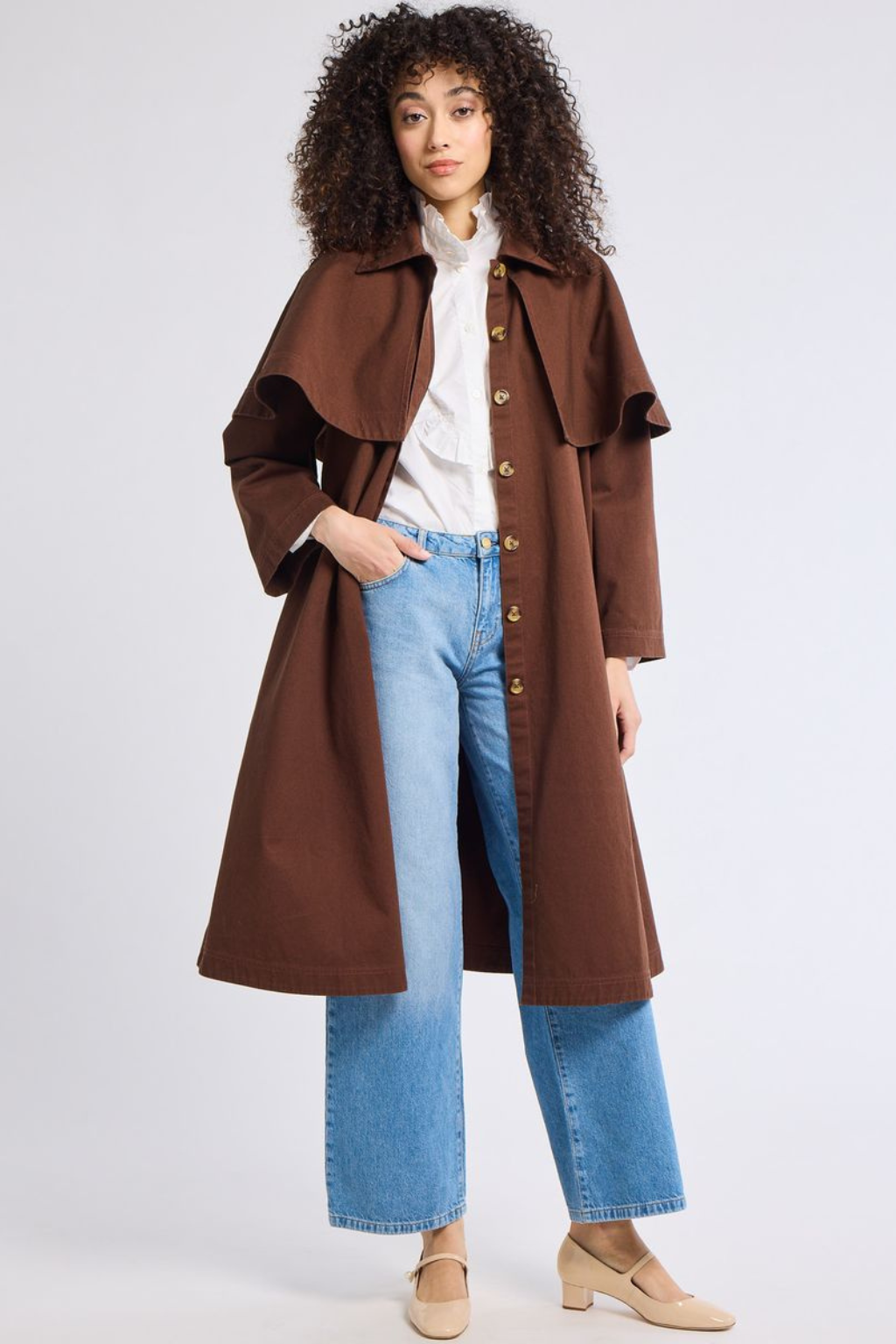 The Alina Coat features a single-breasted a-line midi length silhouette with classic details including a storm flap, faux tortoiseshell buttons, and a bold wide collar, ideal for popping up in chillier weather. Tailored in a chic chocolate cotton twill, this trench promises to keep you warm and stylish all season long.