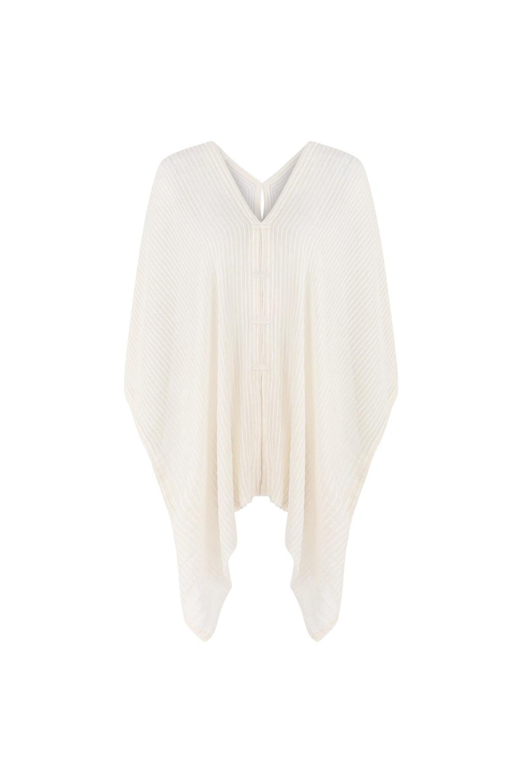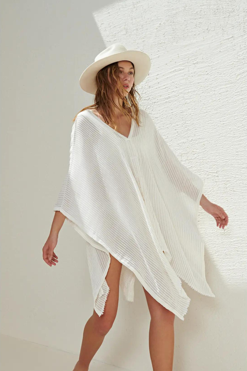 Make a memorable statement by the sea with the hand loomed Ava Kimono. An asymmetric frayed hem along with side slits, add movement and flow to a roomy drape. Artisanal striped motifs are woven into its flowy fabric which boasts a linen-like feel. Breathable fibers and naturally built-in cooling properties make this the perfect beach kaftan. How to wear it: This stand-alone piece can be pulled over a swimsuit or worn over shorts.