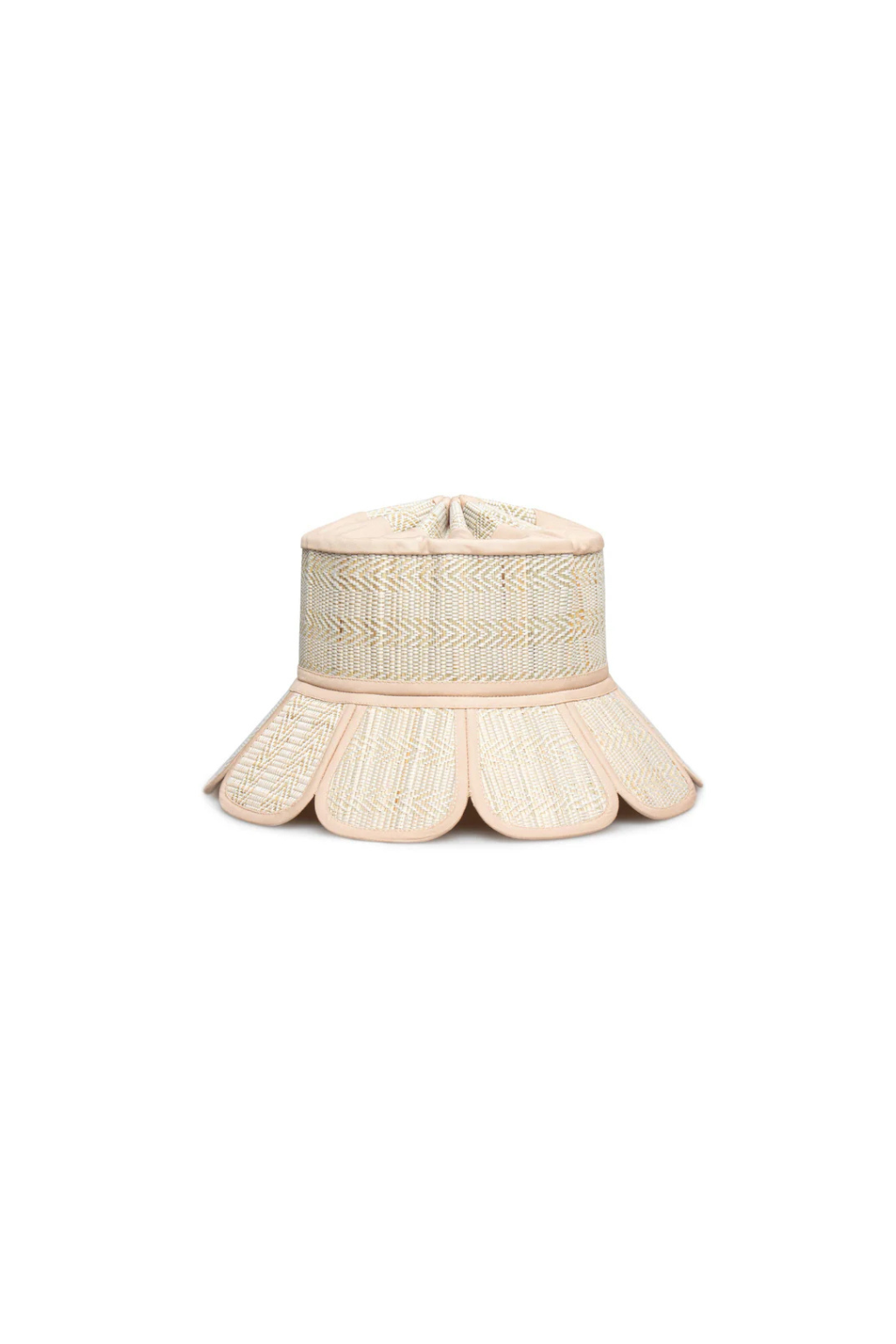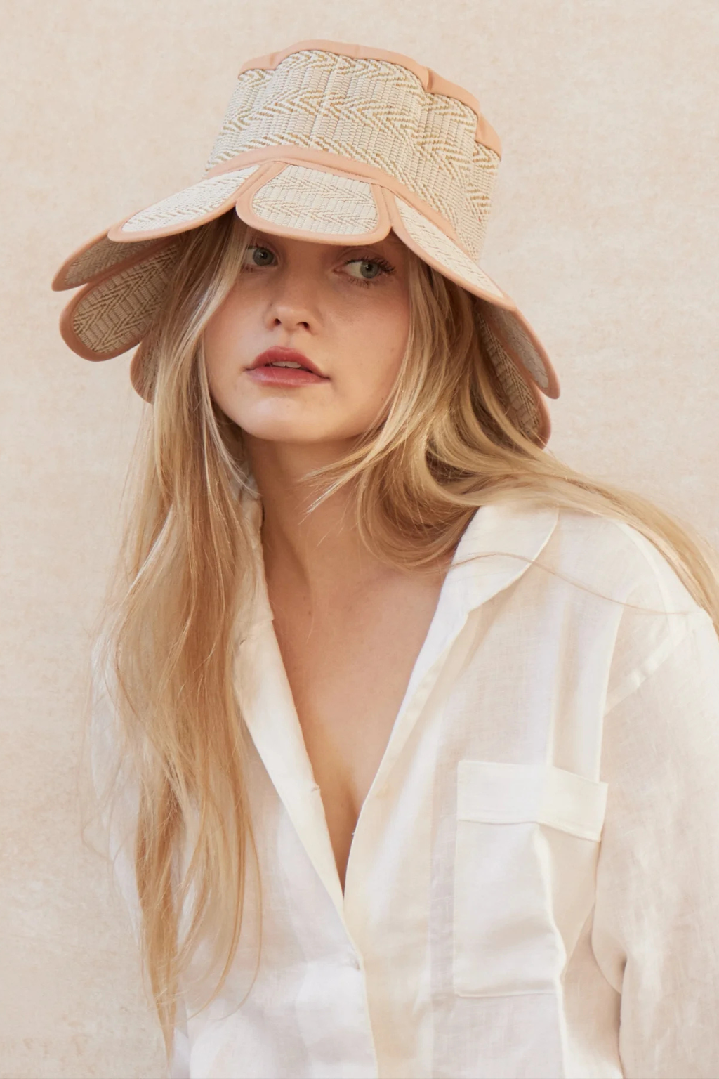 Avoca features white coloured thread woven in an alternating diagonal geometric pattern, through its natural grass fibre base, with pale apricot-coloured fabric trimming. Lorna Murray sun hats combine style and sun-safety. The grass fibre woven material is certified UPF 50+, protecting your precious skin from the elements. Intentionally created for the modern lifestyle, these sun hats can be easily folded, making them compact for travel, perfect for wherever life takes you.