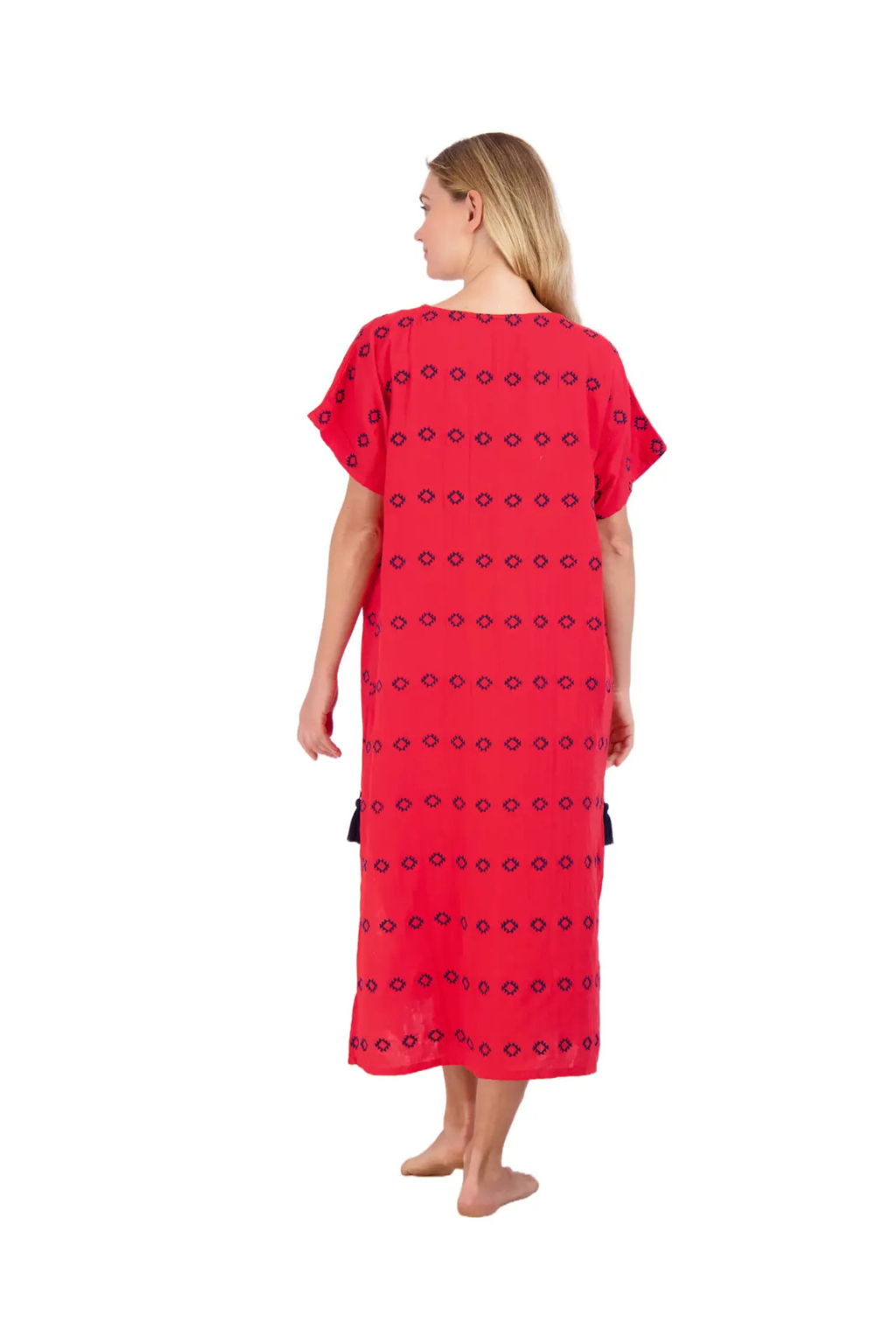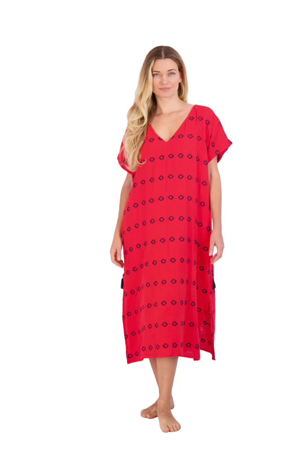 Envelope yourself in this timeless boho chic caftan. Relaxed drop shoulders, embroidered detailing and a deep V make this one-size-fits-most beach-to-lunch cover up stand out. With cotton gauze construction and a maxi length, you'll look fashionable without sacrificing comfort.