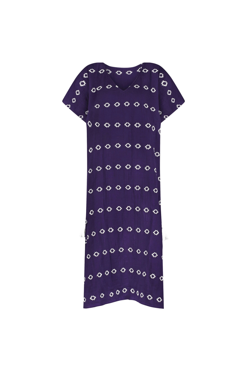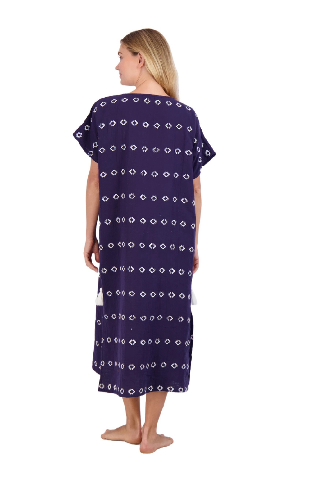 Envelope yourself in this timeless boho chic caftan. Relaxed drop shoulders, embroidered detailing and a deep V make this one-size-fits-most beach-to-lunch cover up stand out. With cotton gauze construction and a maxi length, you'll look fashionable without sacrificing comfort.