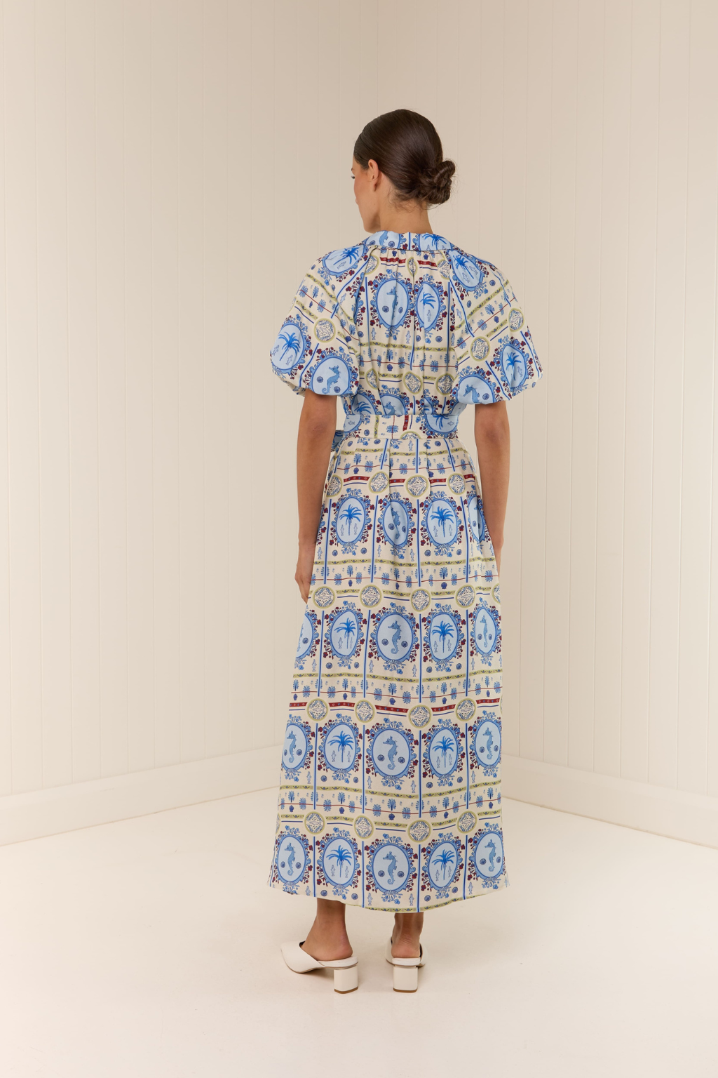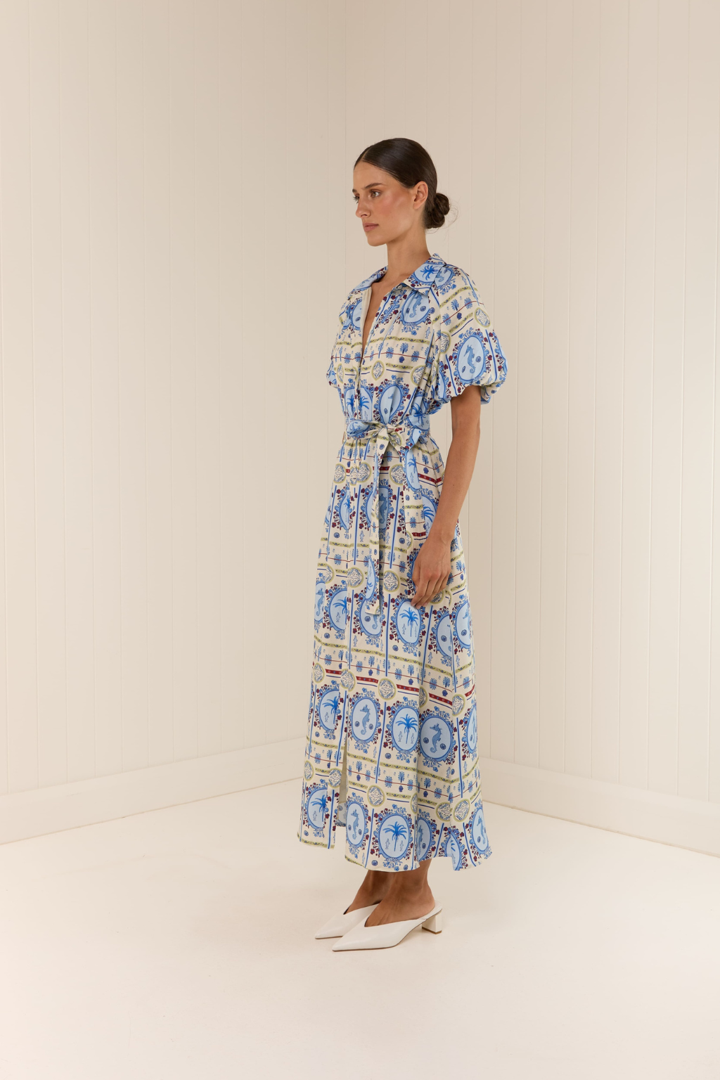 The Carla Dress is crafted from a premium Silk Twill Blend, in the exclusive Lagoona Tile print. Featuring a stand collar, voluminous blouson sleeves and an adjustable waist tie and side pockets to create a relaxed yet elevated look.