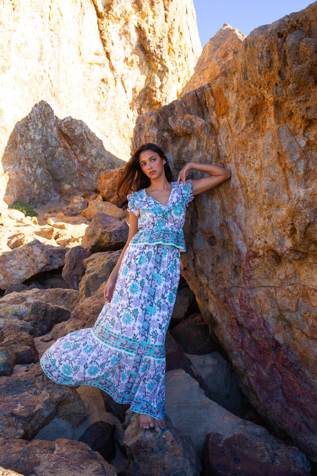 Silk cotton voile hand blocked drawstring waist tiered maxi skirt.