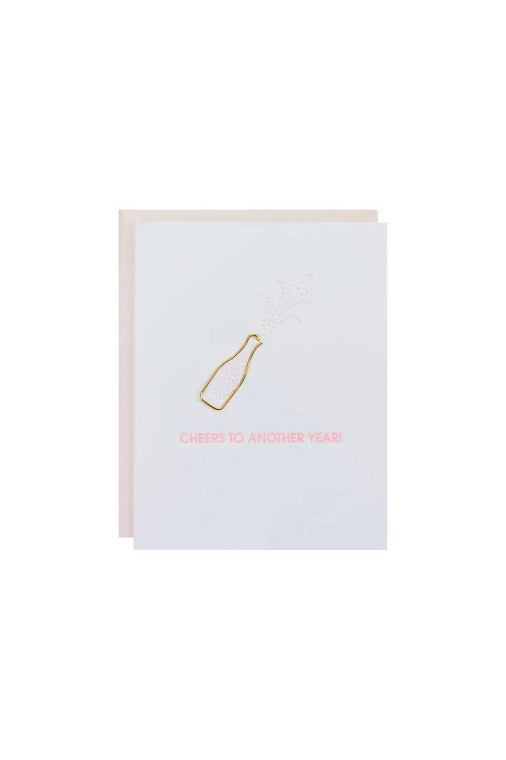 The "Cheers To Another Year" card is letterpress printed on a vintage printing press in sunny California. Card includes a heavy duty bottle paper clip. Paperclip can be used as a giftcard or cash holder on the inside of the card. Once you are finished using with the card, it can be used as a paperclip or bookmark.