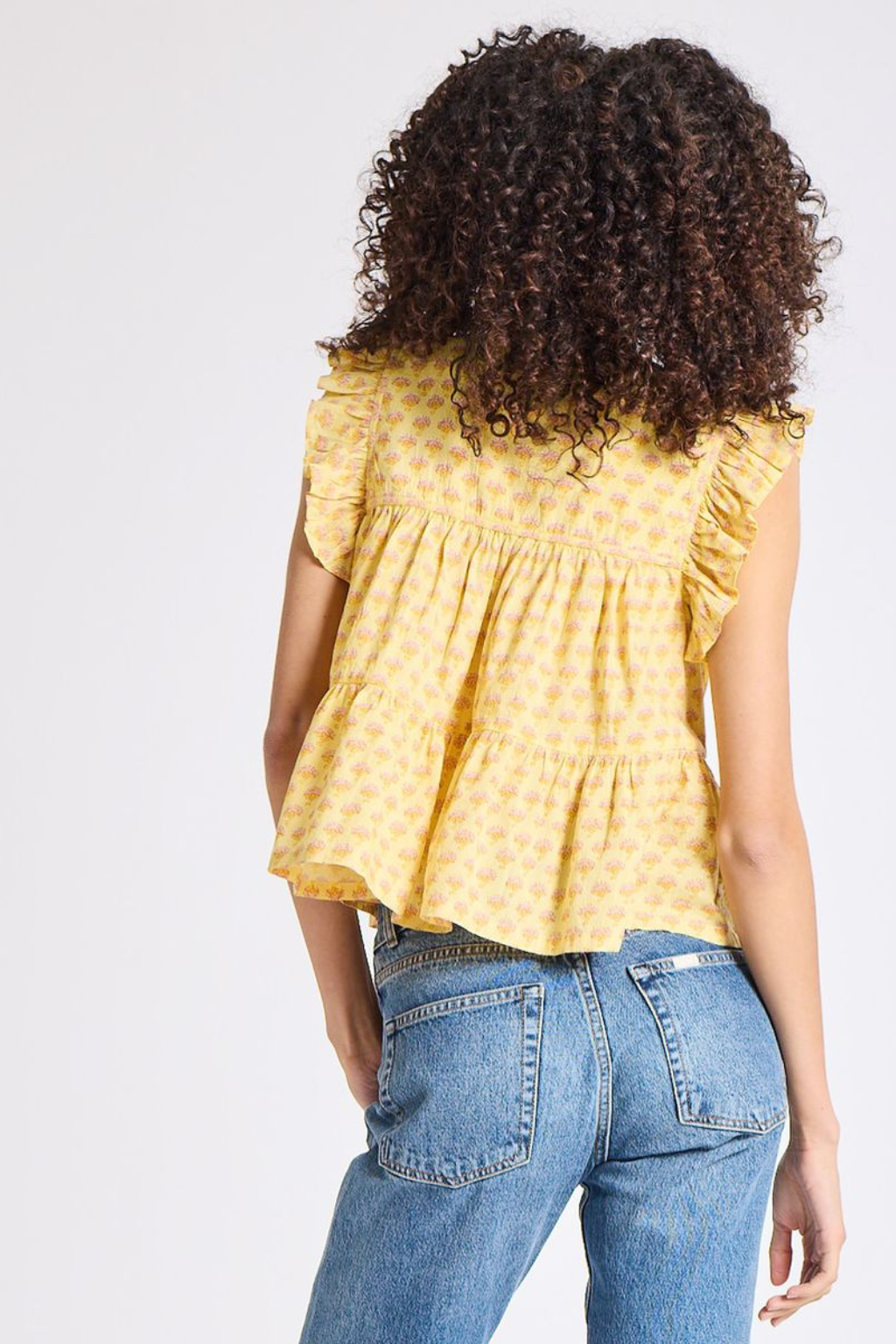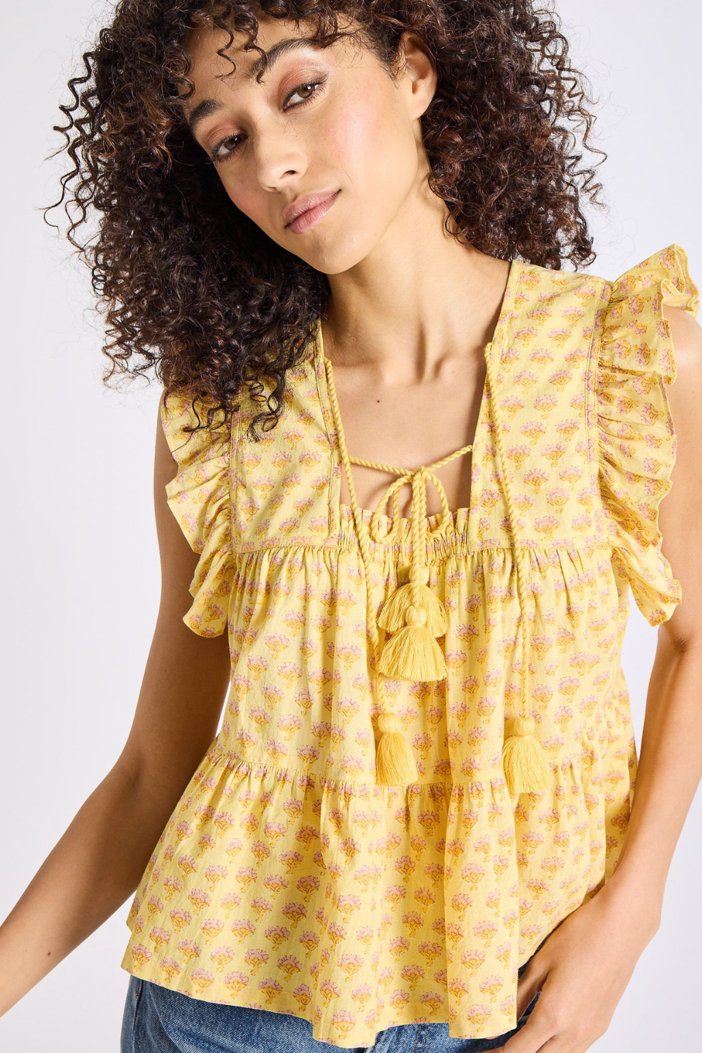 The Chelsea top has a universally flattering fit. Slightly cropped with a little swing through the body and a wide ruffle hem. Narrow, square neckline with tassel ties and a pleated ruffle along the shoulder opening.