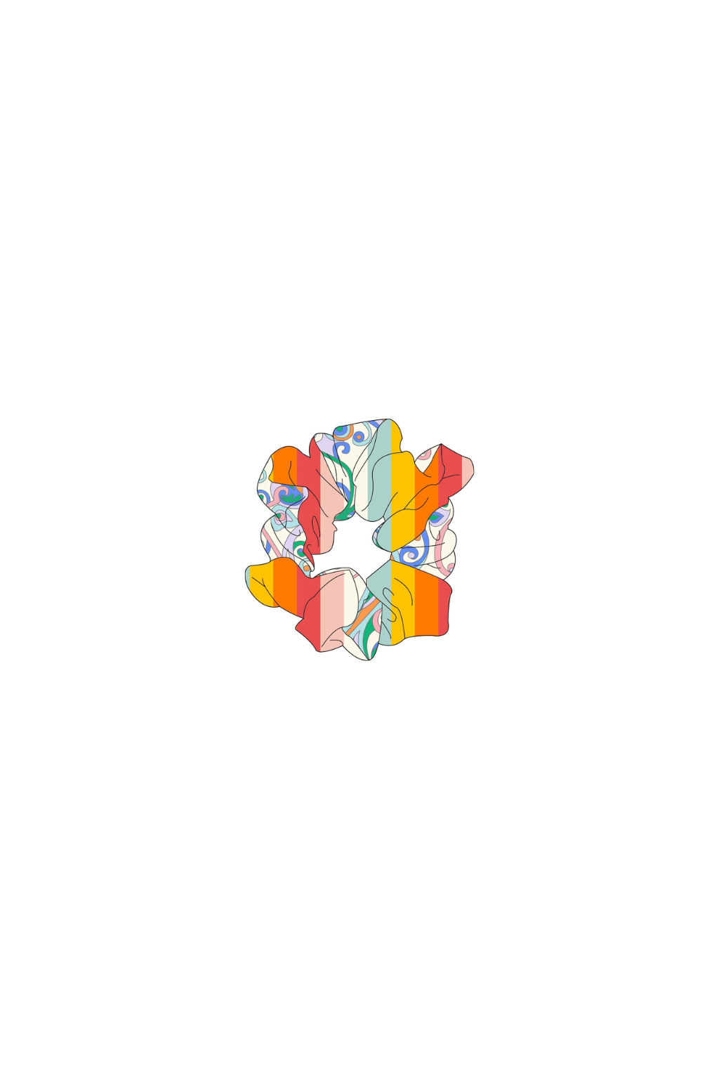 Chouchou hair tie in silk twill, patchwork of two exclusive prints “MULTI STRIPES” and "ARABESQUE".
