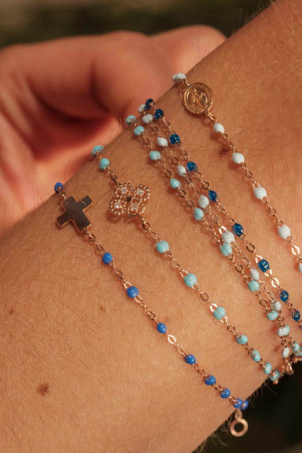 This bracelet is crafted in 18 carat rose gold with a rainbow of colored bead choices. Wear alone or to stack depending on your mood, state of mind or special occasion! Add a Gigi Pendant to personalize. Chain is 6.7" long. Jewelry is final sale.