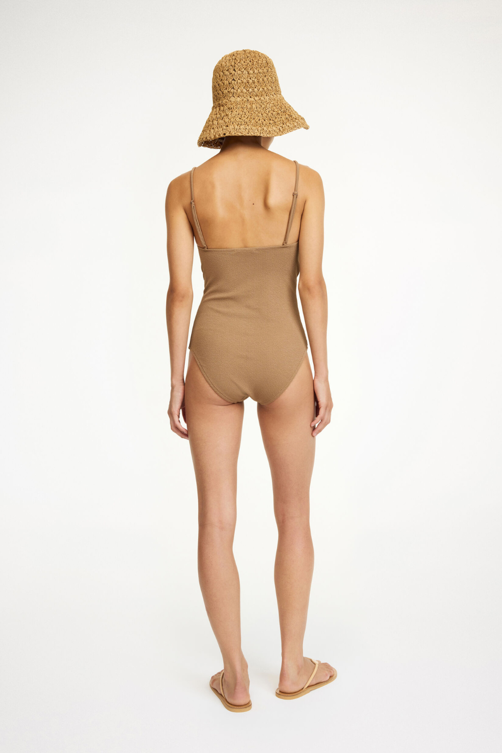For uncomplicated lounging by the pool or the seaside, opt for the tactile Cocesa swimsuit. The minimalist design has a distinct cut-out neckline, high-cut legs and adjustable straps that are easily taken on and off, depending on your mood. Its finest detail? The small, embroidered monogram on its front.