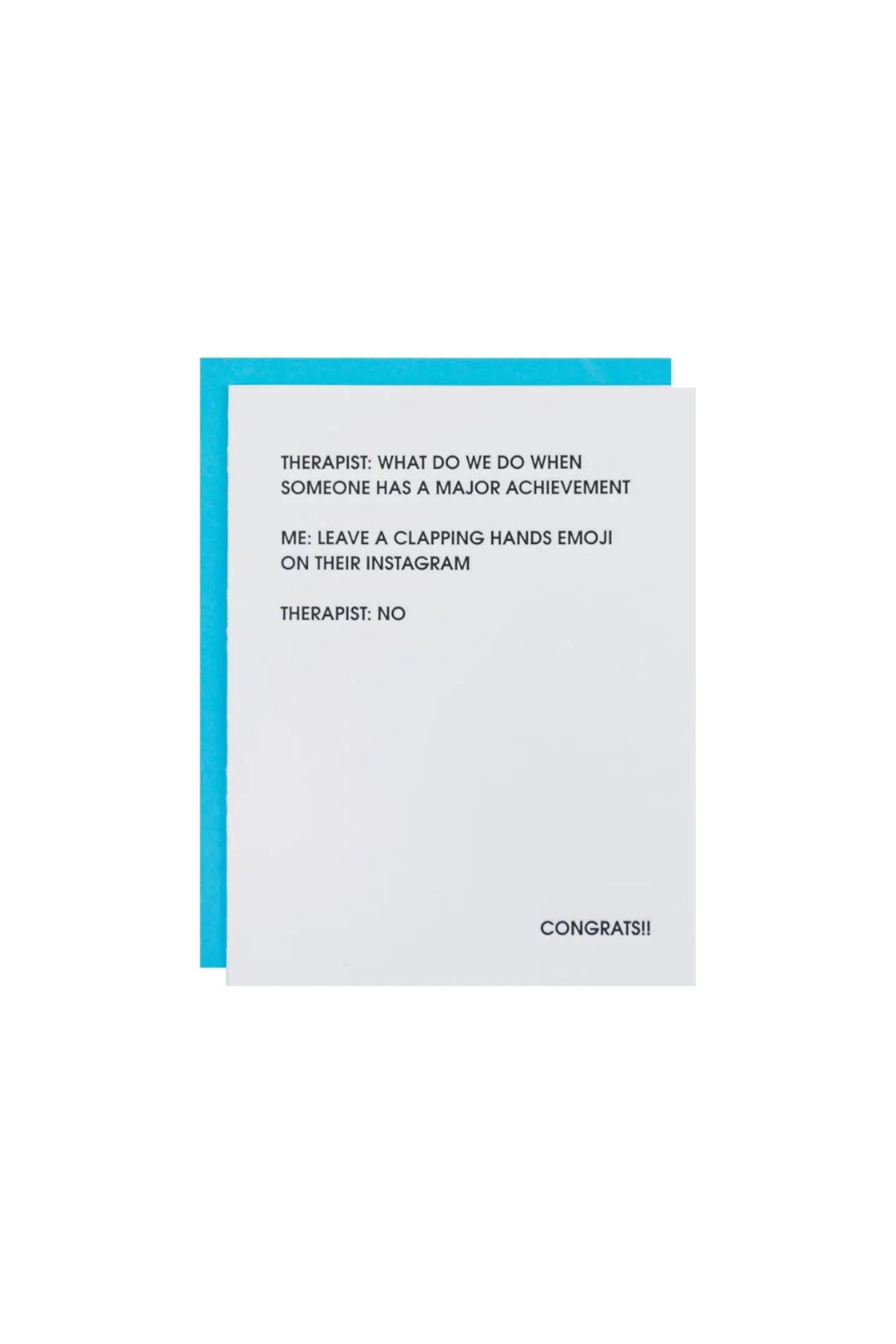 The "Therapist: Clapping Hands Congrats" card is letterpress printed on a vintage printing press in sunny California.
