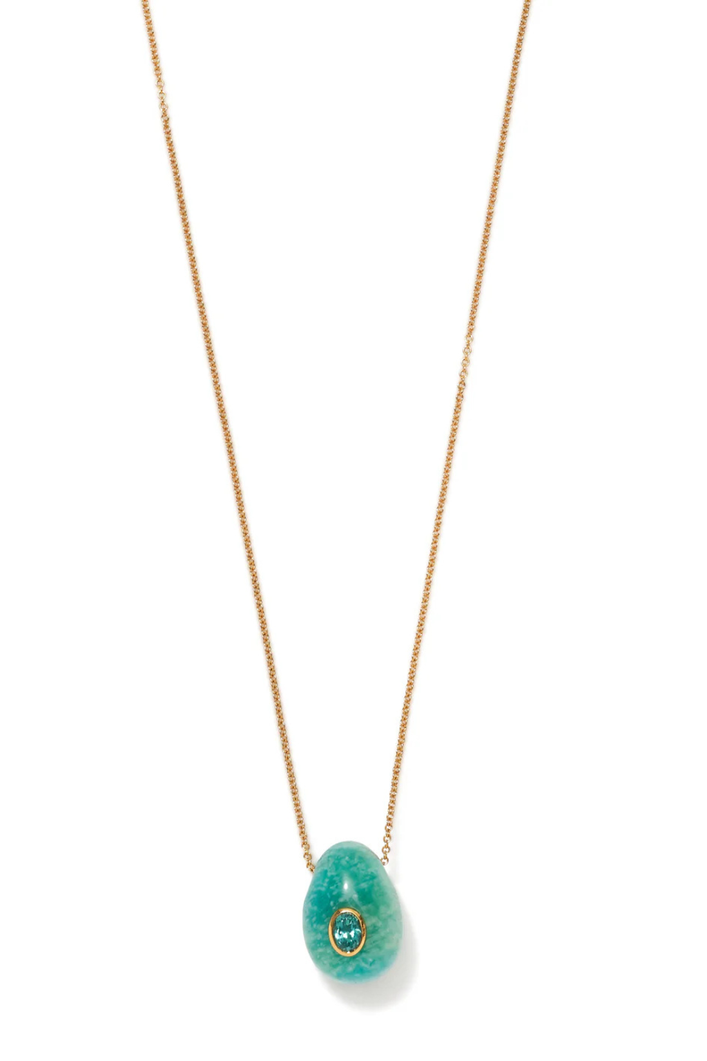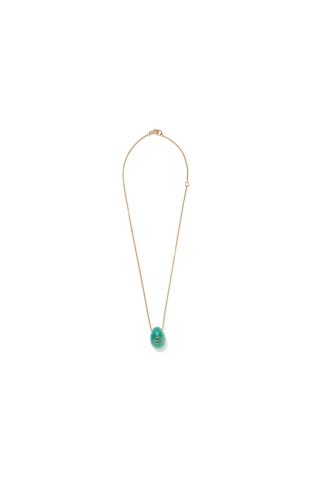 Make our Constance Necklace the chic crown jewel in your accessories arsenal. Featuring a delicate gold-plated brass chain capped off with a bright Brazilian amazonite egg pendant, inlaid with faceted semiprecious green topaz.