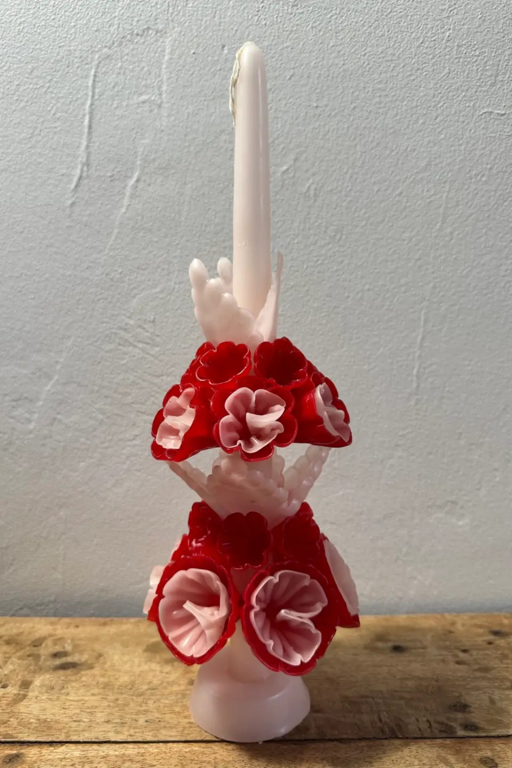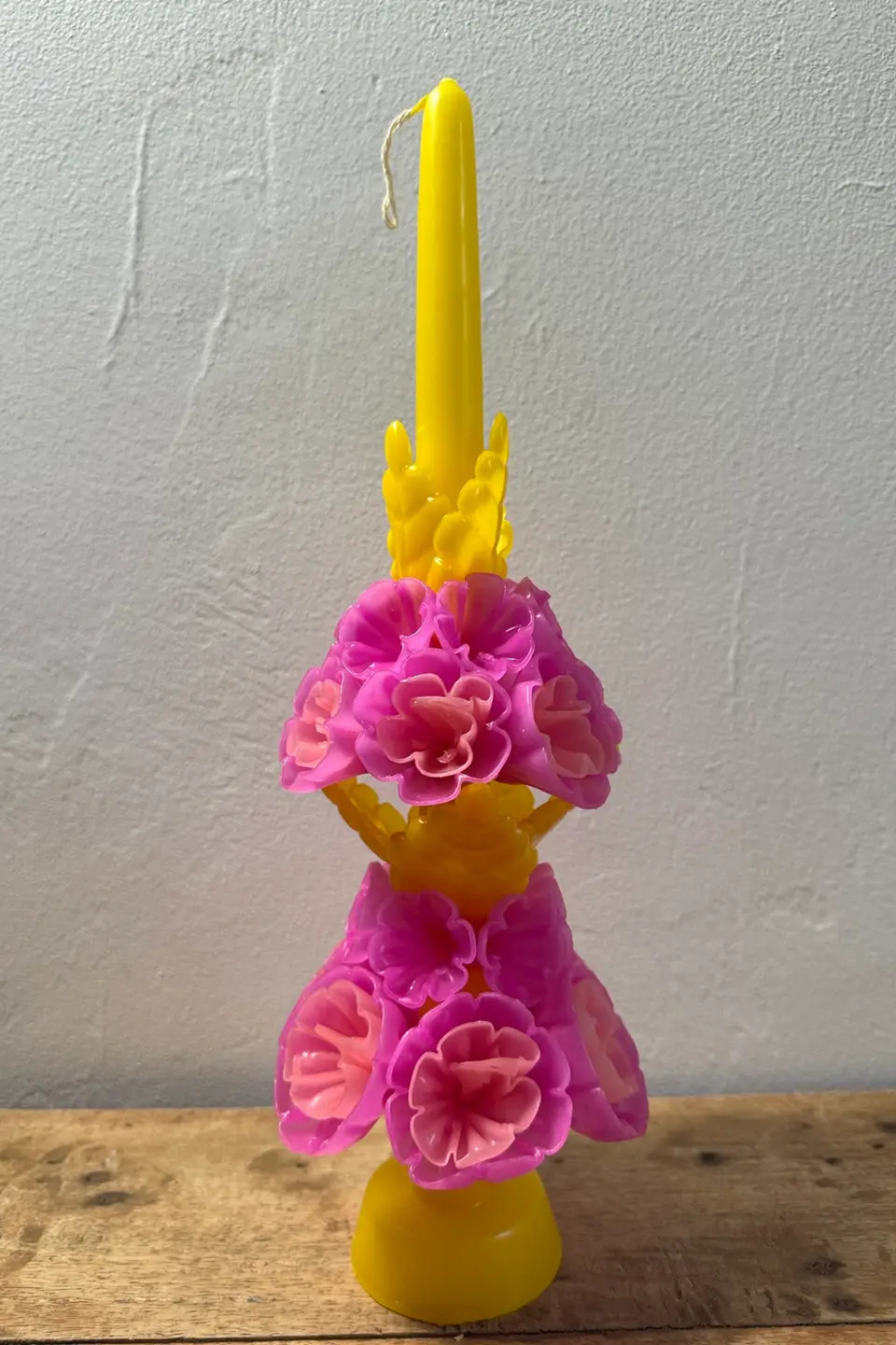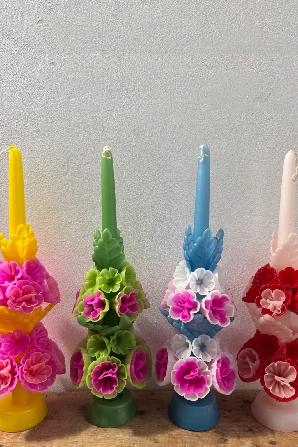 Handmade in Mexico, elegant and unique, this tall floral candle is a perfect gift. The variety of colors allows one to mix and match to your personal palette. Stunning to burn or also lovely to leave as a decorative piece. Due to the craftsmanship, slight variations in size, texture and color may occur. Candles are quite fragile and must be kept away from extreme heat. For best results trim wick to 1/4 inch before lighting.