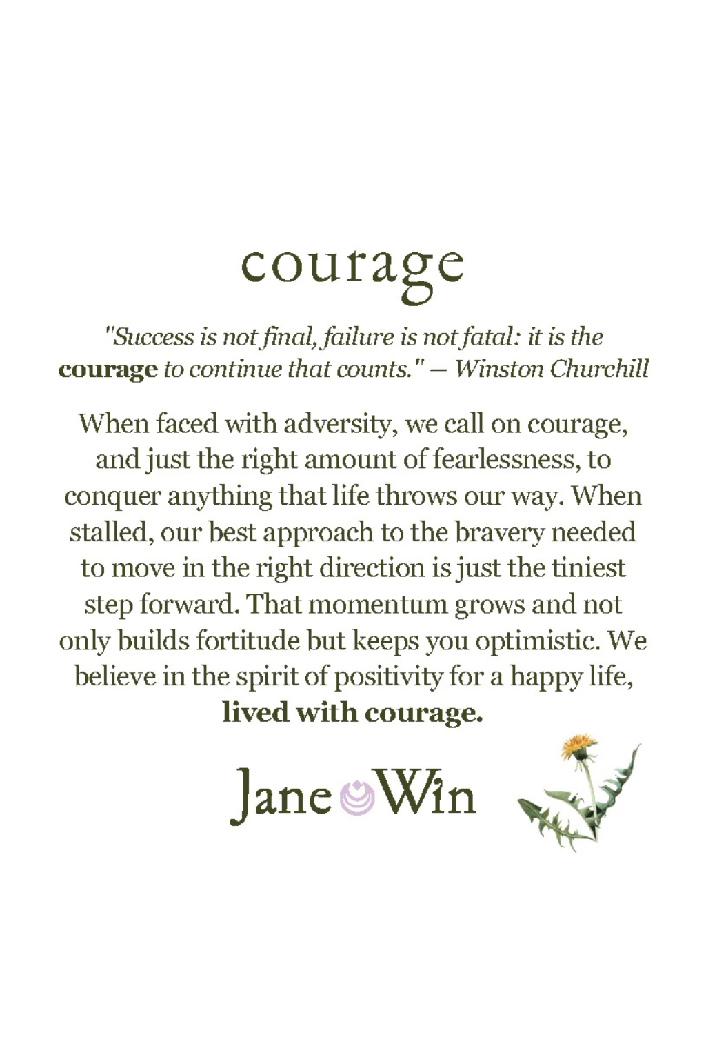 When faced with adversity, we call on courage, and just the right amount of fearlessness, to conquer anything that life throws our way. When stalled, our best approach to the bravery needed to move in the right direction is just the tiniest step forward. That momentum grows and not only builds fortitude but keeps you optimistic. We believe in the spirit of positivity for a happy life, lived with courage.