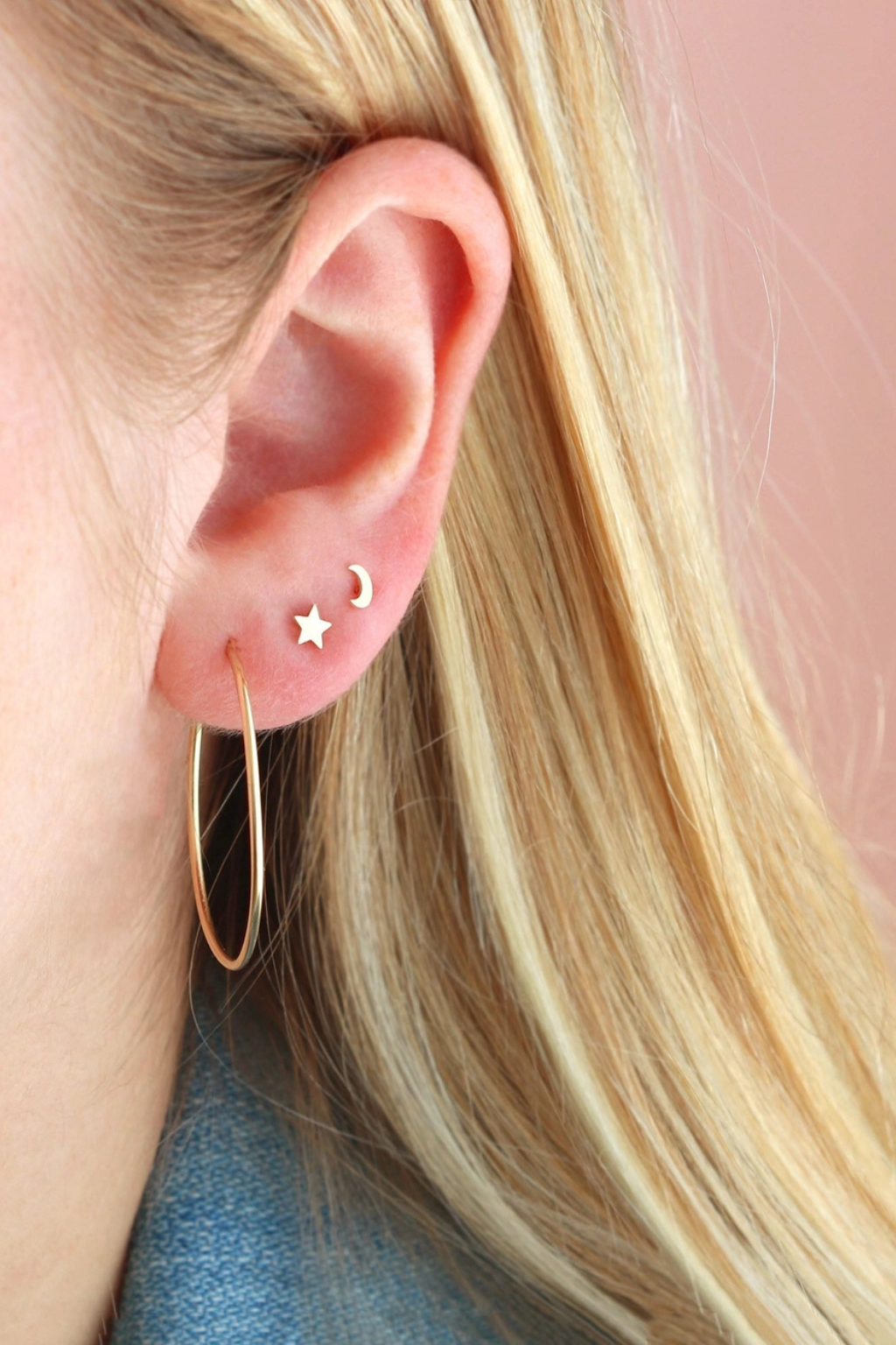 Classic Crescent Moon stud earring with a threadless flat back push pin style backing. Available in 14k yellow gold. Moon measures 4mm.åÊ Threadless Flat back pin measures 6mm length, 20 gauge thickness. Perfect for wearing 24/7 and never taking off. The flat pin back makes earrings comfortable enough to wear during sleep and all of life's adventures.