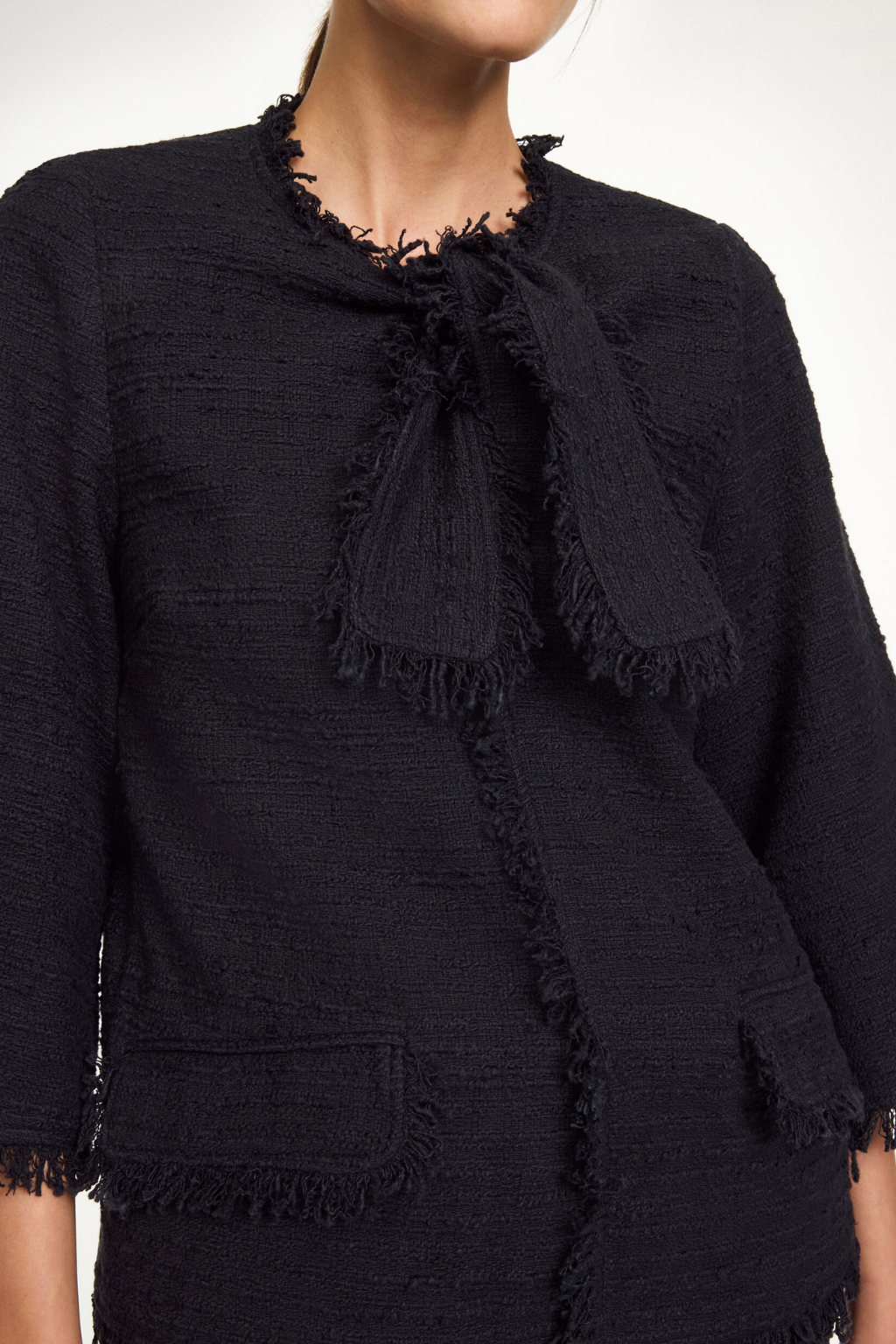 A chic and classic addition to your edit, the Diana boucle jacket is made in a tactile cotton mix. The feminine design is detailed with faux front pockets and fringe hems. The finest detail? The lady-like front tie. Diana is pull on with no front opening.