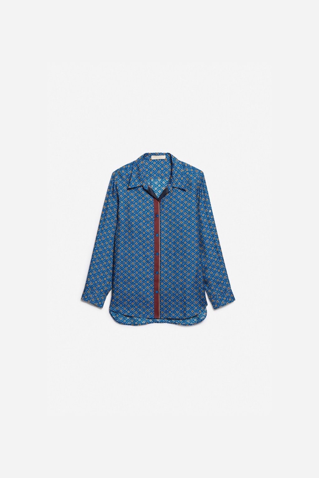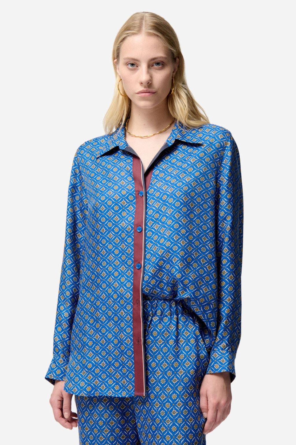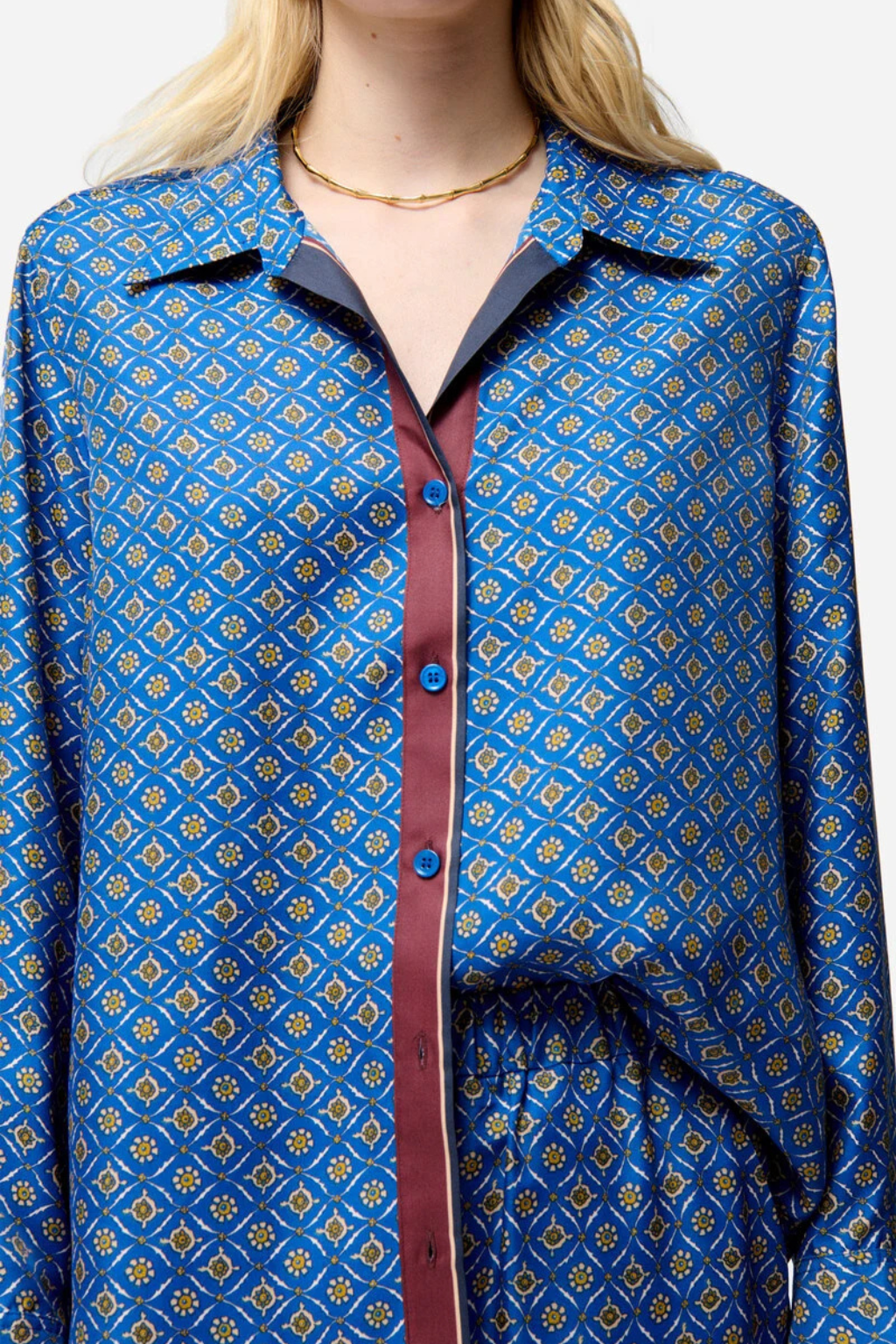 The Dorothée printed shirt is crafted from a flowing silk and viscose fabric with a straight cut, shirt collar, long sleeves, button closure at the front and contrasting button placket.