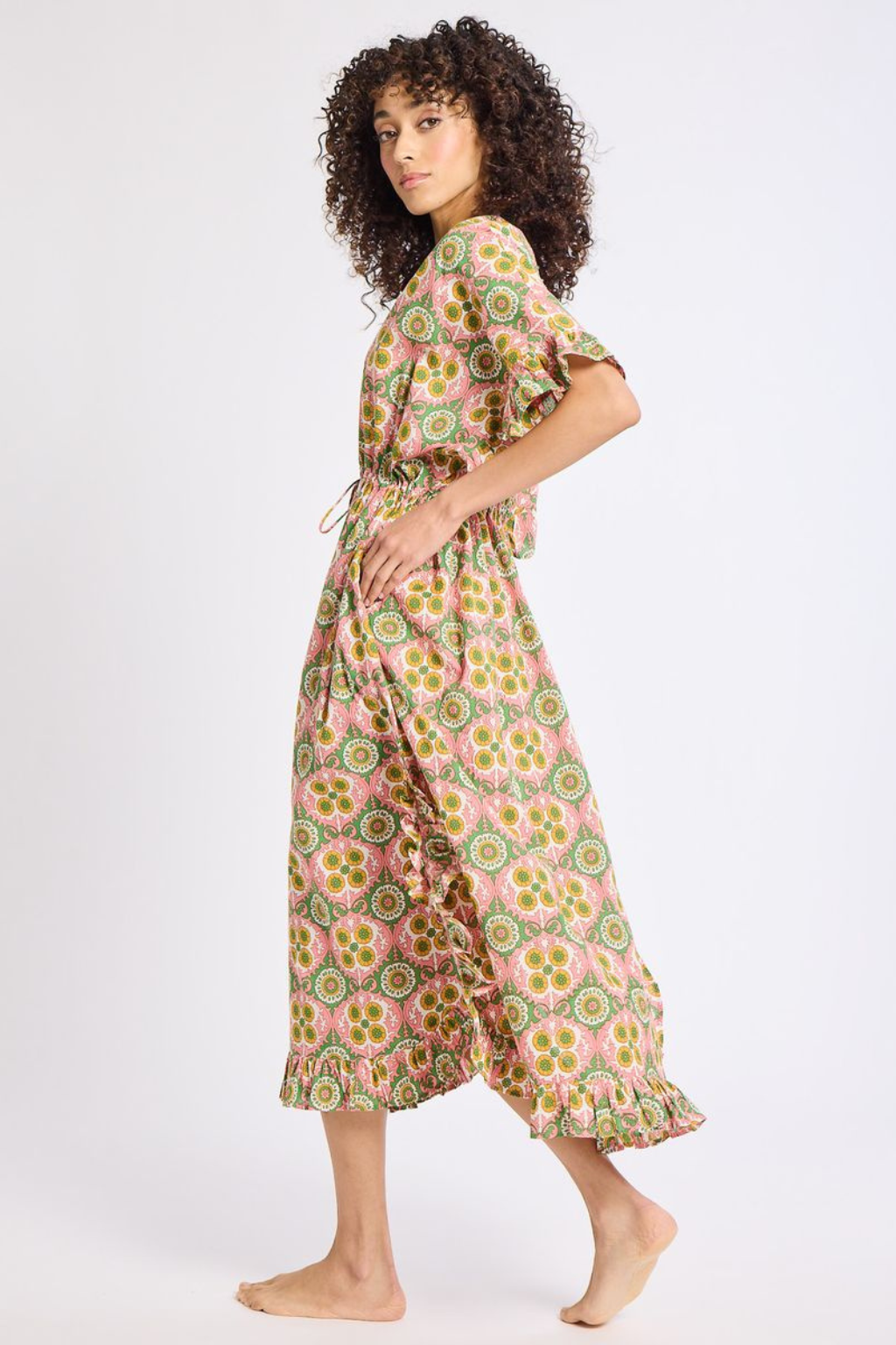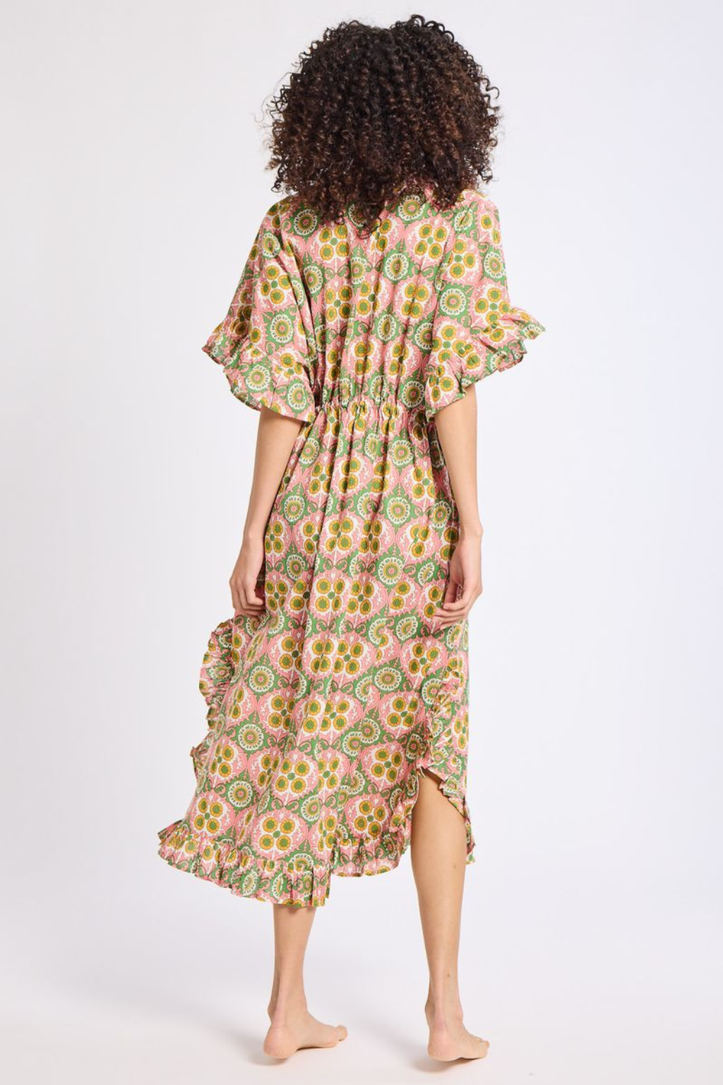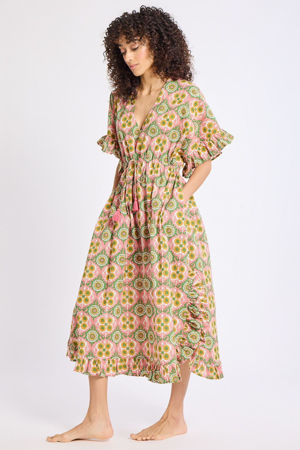 The Eden caftan is a showstopper poolside, at the beach or anywhere your heart desires. Available in one size. Features an adjustable tie waist with tassel detail. V-neck with ruffle trim along hem and sleeve, side slits and pockets. Pullover styling. No stretch.