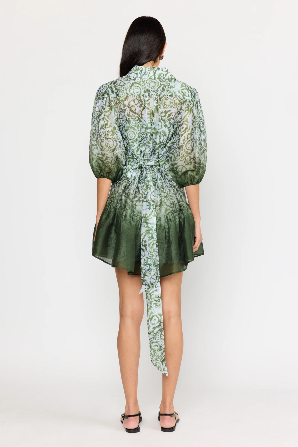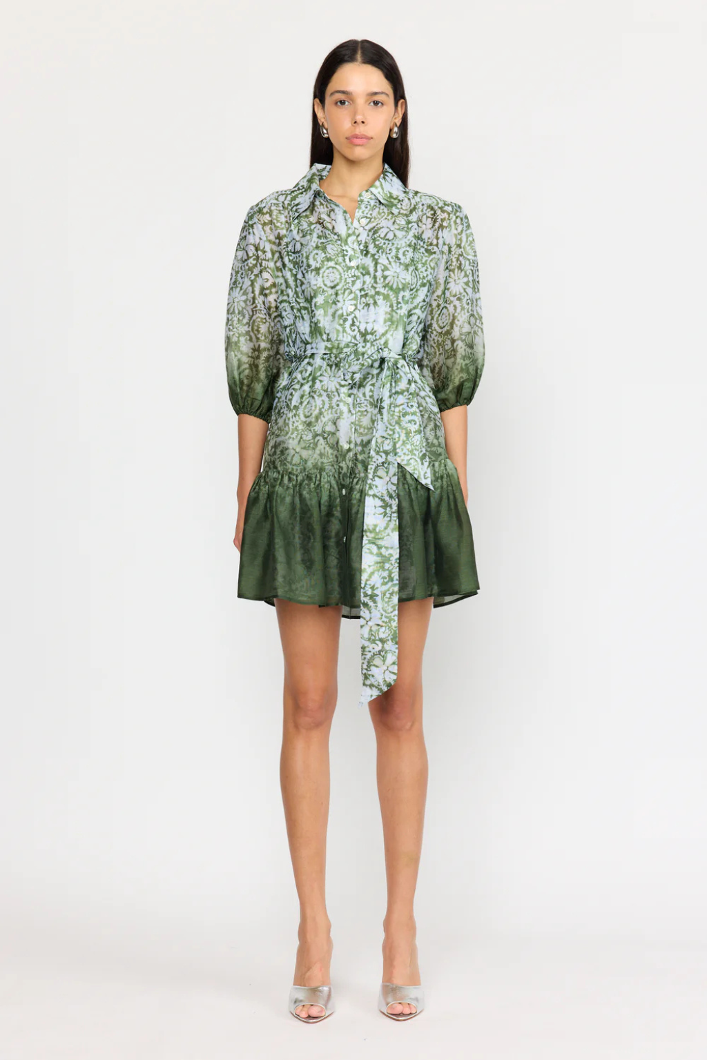 The Erin is Christy Lynn's classic Emi dress reimagined with a dark gradient, perfect for any high Summer occasion. She features puff sleeves with elastic at the cuffs, a feminine ruffled tier at the skirt, and a high-neck collar. The dress closes with Christy Lynn mother-of pearl buttons down the front placket and has a detachable self-tie belt at the waist for enhancement. Complete with a matching stretch slip.