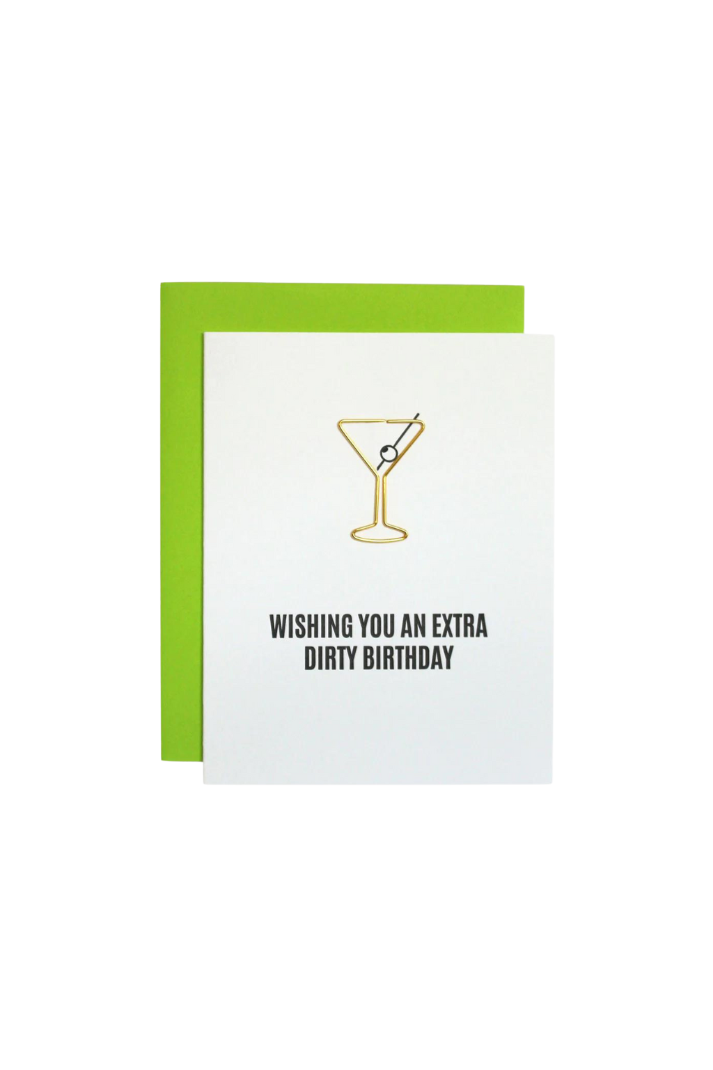 The "Extra Dirty Birthday" Martini Paper Clip Card is letterpress printed on a vintage printing press. Card includes a heavy duty gold martini glass paper clip.