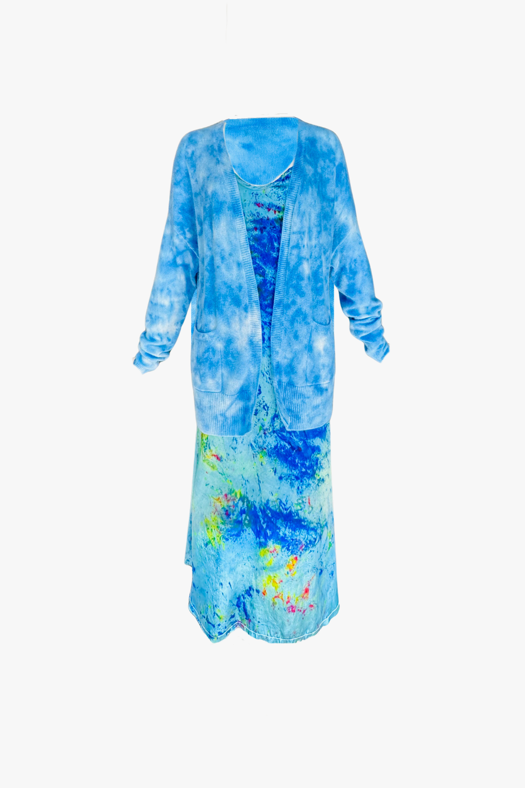 Slip style dress with adjustable straps. Hand dyed in Ojai, California. Layer with the matching cardi for a luxe boho look.