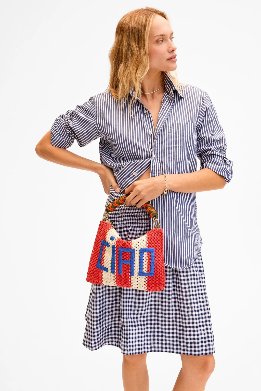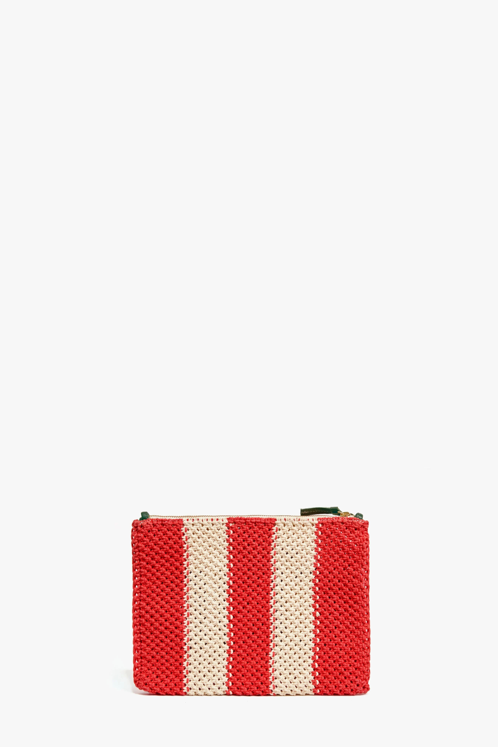 The original flat clutch now with tabs so you can add a strap to carry your phone, wallet, keys on your shoulder or as a crossbody. Made of crocheted cotton with leather loop tabs for strap attachment. Unlined. Cream zipper. No interior compartments or pockets.