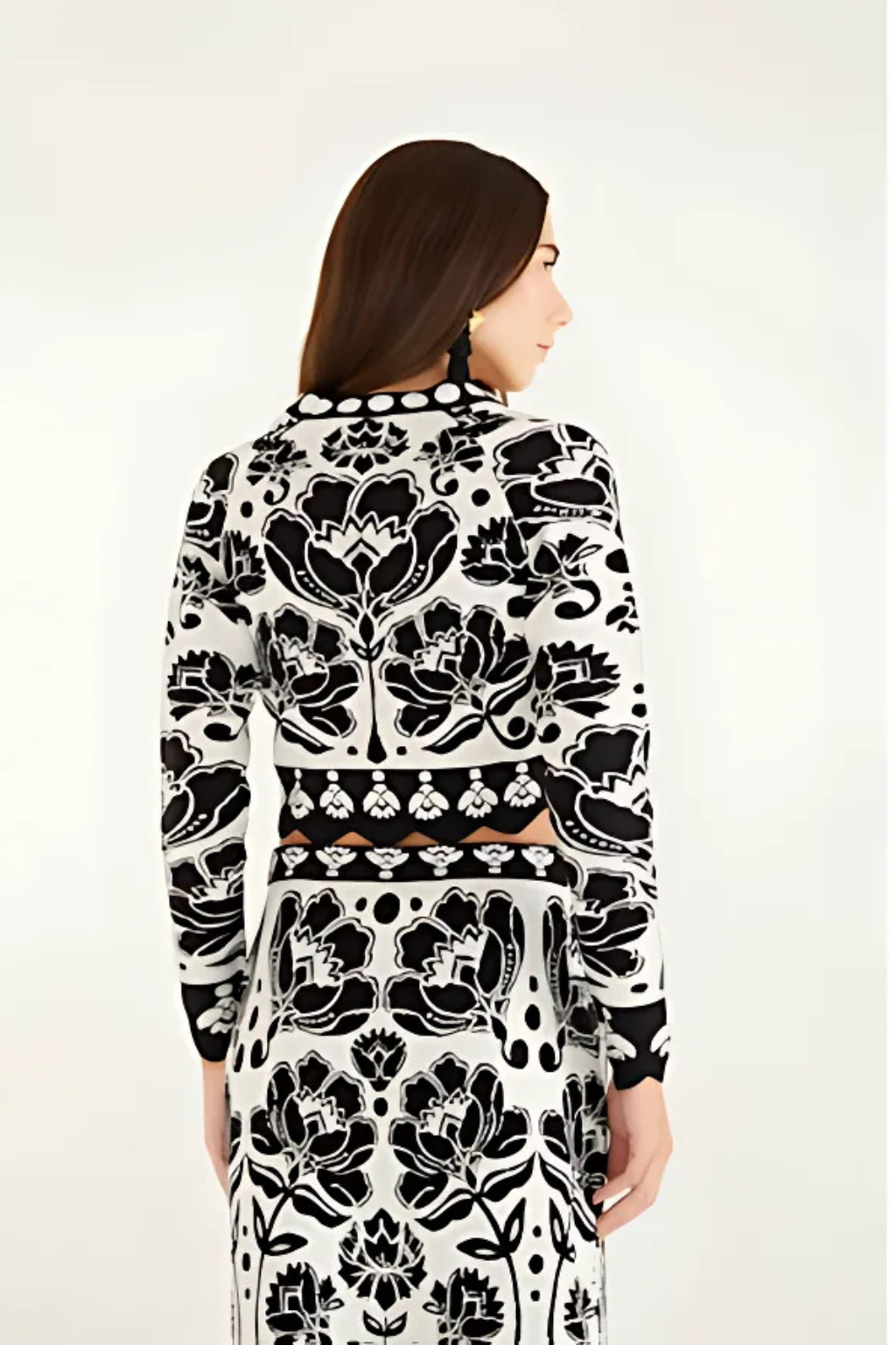 The Floral Arabesque Cropped Cardigan envelops you in the bold contrast of a black and white beautifully intertwining an artistic floral landscape. The form fitting silhouette, featuring a flattering V neckline, adds a touch of elegance to every occasion. Rich patterns dance across the fabric, making each glance a discovery. This cardigan invites you to embrace nature’s beauty with a soft, stylish hug.