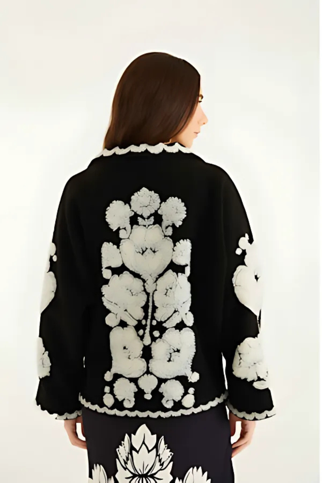 Embrace cozy elegance with the Floral Arabesque Fleece Coat by FARM Rio. This playful piece features a striking jacquard floral pattern in bold white on a black ground. The relaxed silhouette and shawl collar invite warmth and ease, while intricate borders add a touch of artistry. It’s a vibrant outerwear essential that feels like a gentle hug from the heart of Brazil.