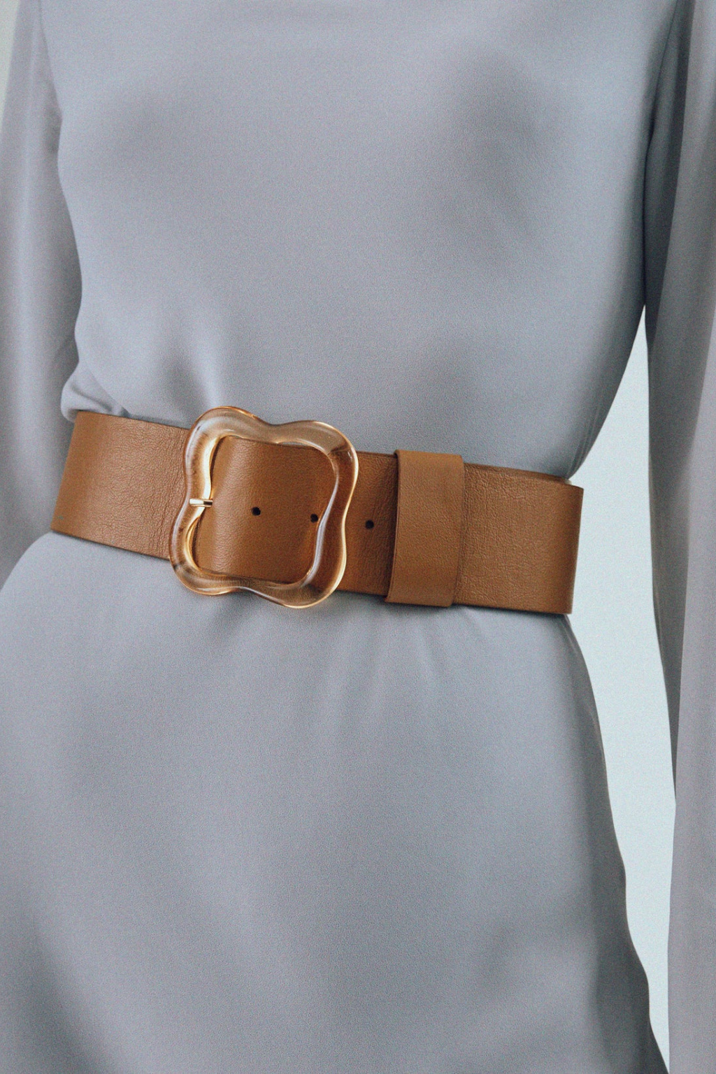 Cinch a trench, pencil skirt, or high-waisted pants with the sleekly chic Florence Belt, in signature amber leather with a clover-inspired buckle in honey-colored resin.