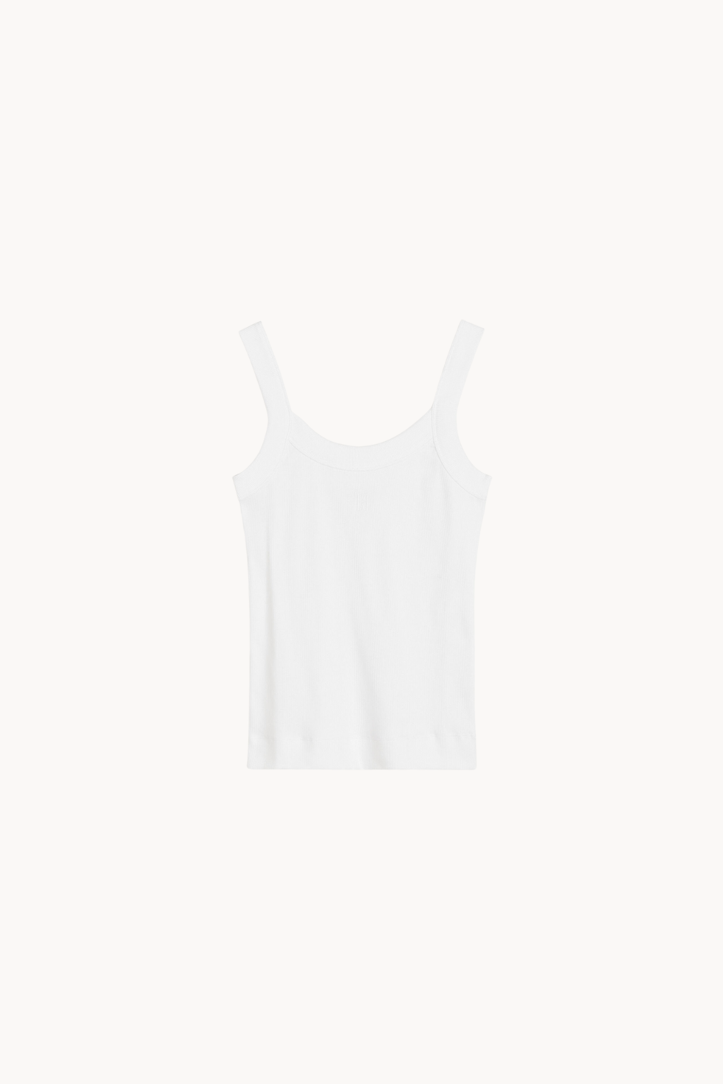 A versatile minimalistic tank top – such as the Frillio design – will slot right into any modern woman’s wardrobe. Made in an organic cotton mix with stretch, the easy silhouette falls from wide straps and has a low round neckline. Notice the small, embroidered monogram on its front.