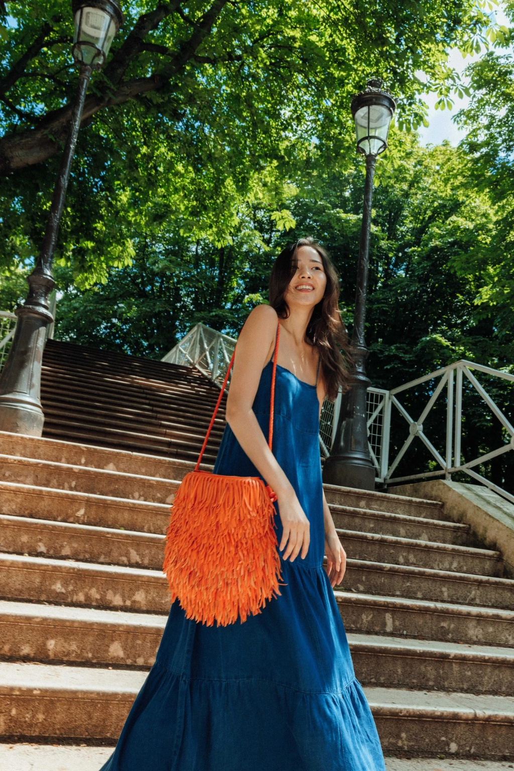 The "Fringe Hobo" captures the essence of the 70s with its stylish fringed design and supple construction. This bag features soft, comfortable straps that can easily be worn over the shoulder or across the body, offering versatile carrying options. Its relaxed yet chic appearance makes it perfect for adding a bohemian touch to any outfit, while the practical design ensures it's suitable for everyday use.