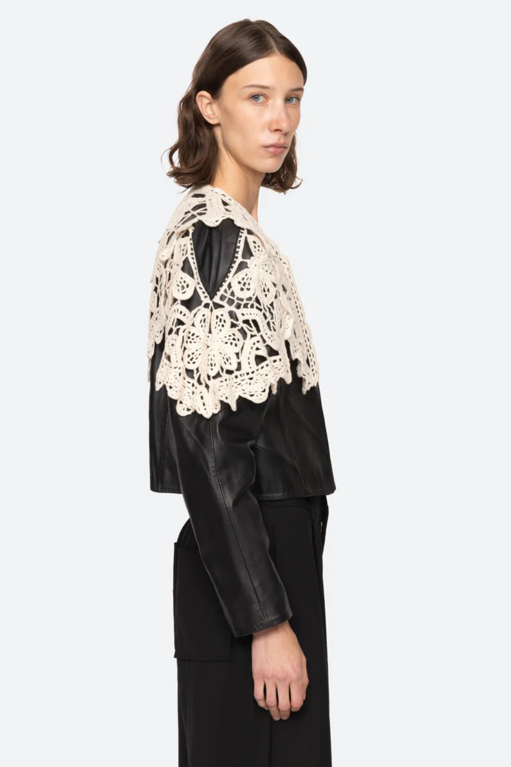 The Gwen leather jacket is crafted from smooth leather in a cropped silhouette. Delicate hand-crocheted detailing across the upper body lends a refined, artisanal finish. Front hook closure. Designed for a relaxed fit.