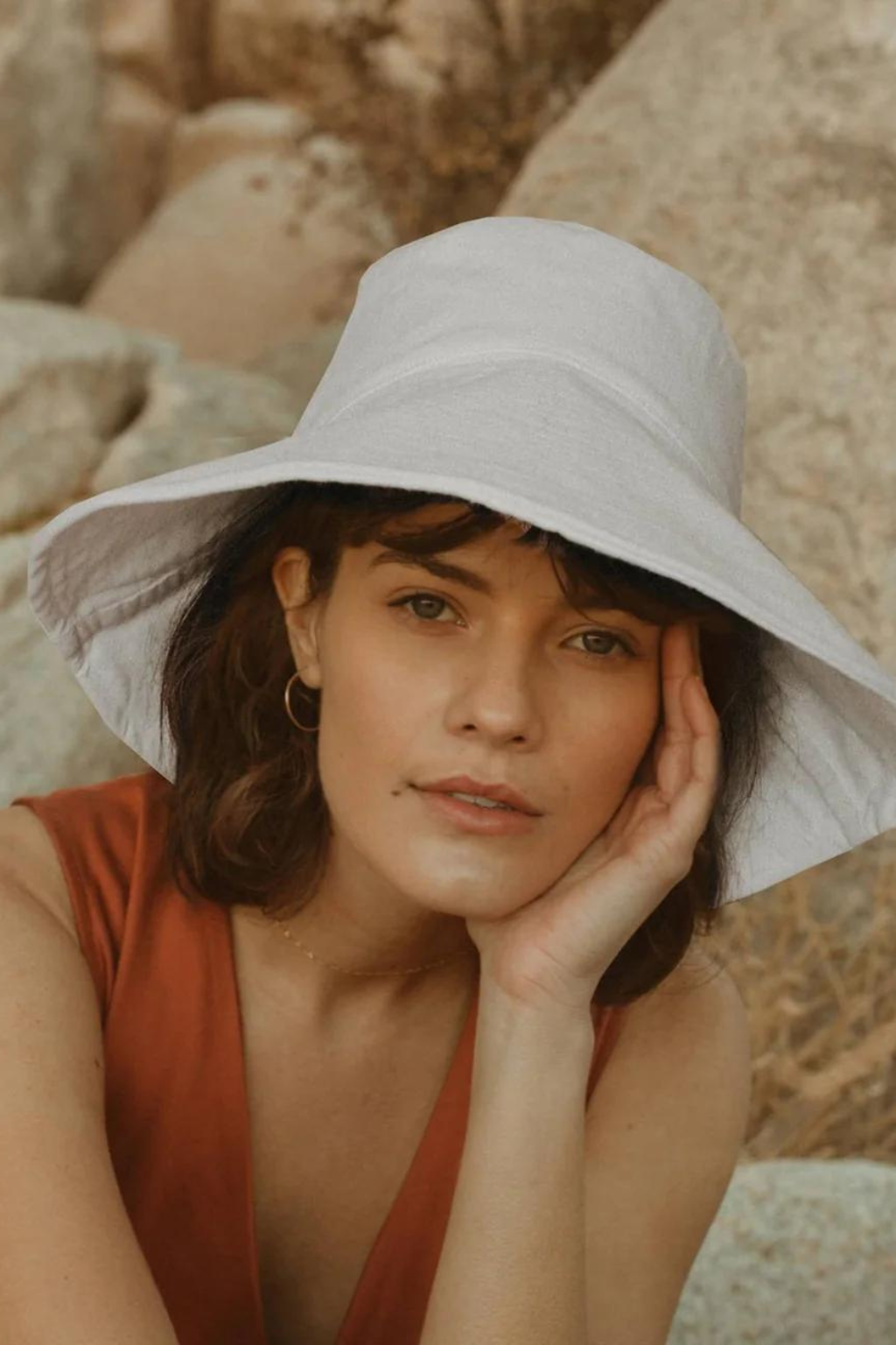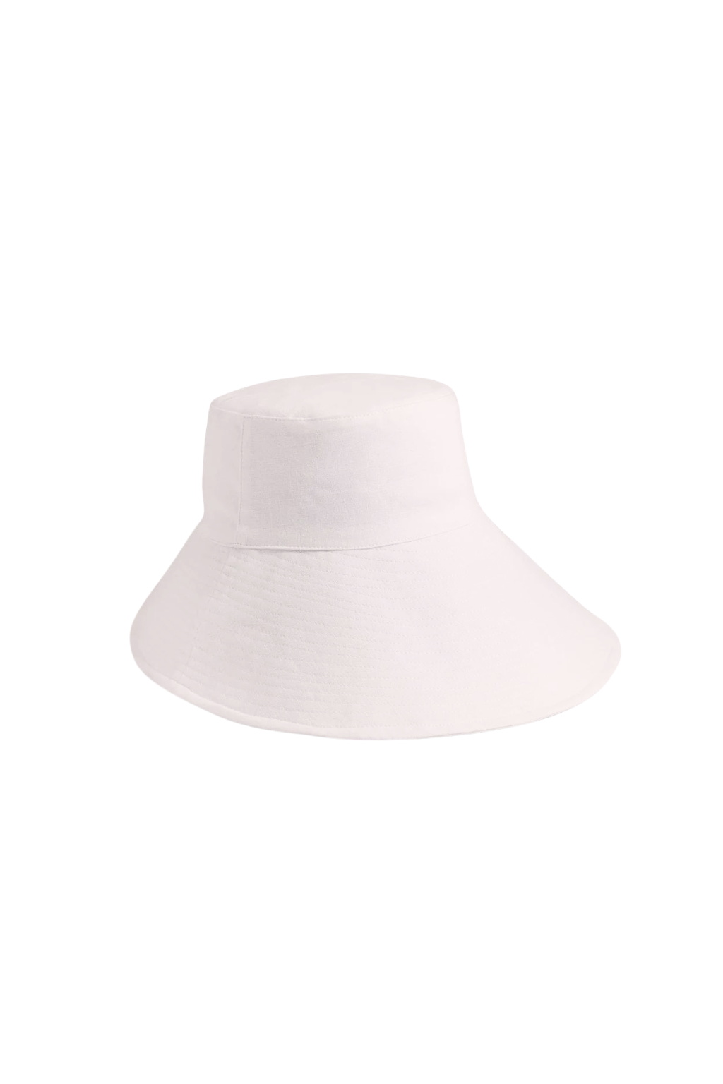 Freya's bestselling Hazel bucket hat in a new, vanilla canvas. Structured brim allowing you to custom shape your hat. This hat is asymmetrical with broader brim on one side; may be worn with 10cm or 12cm brim facing forward.