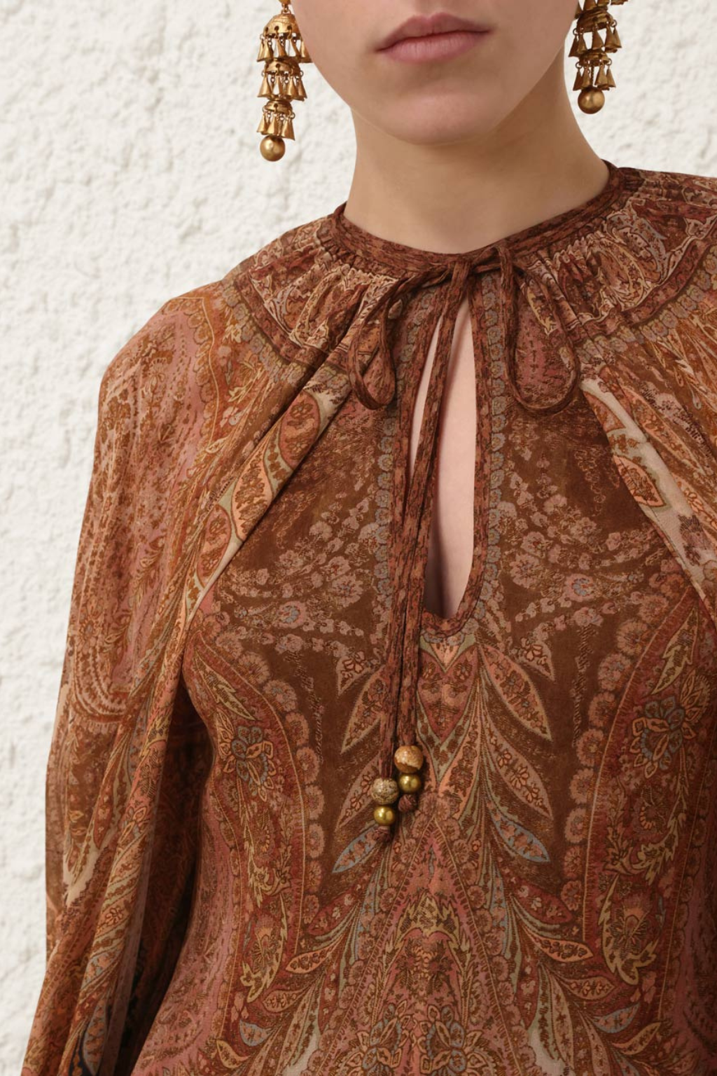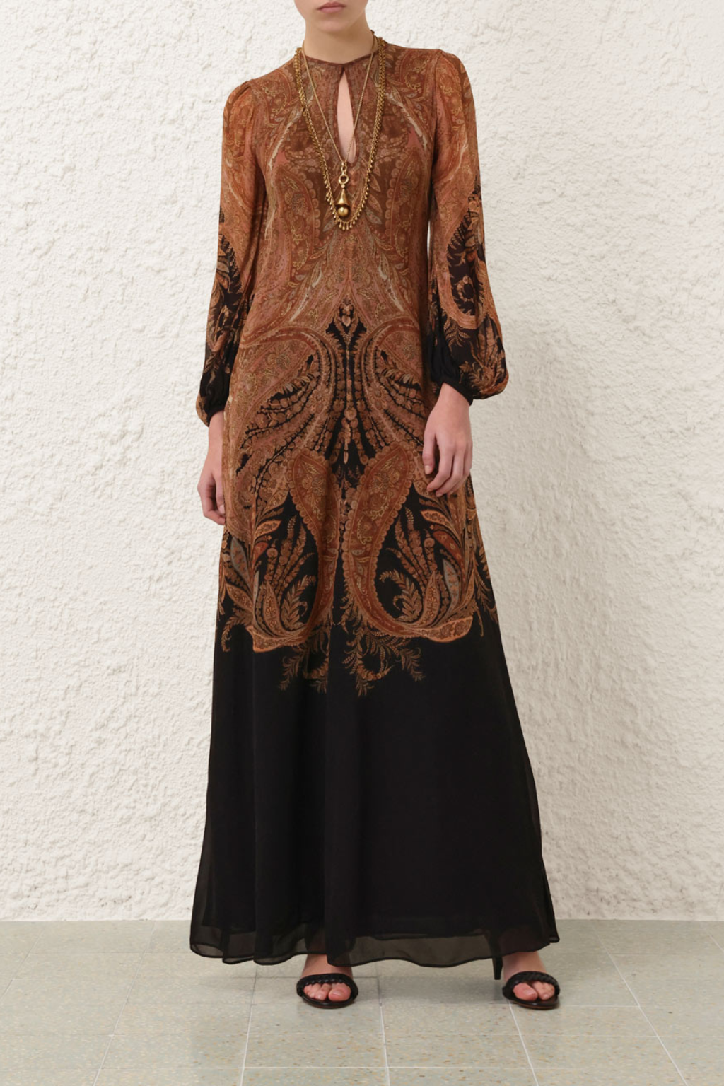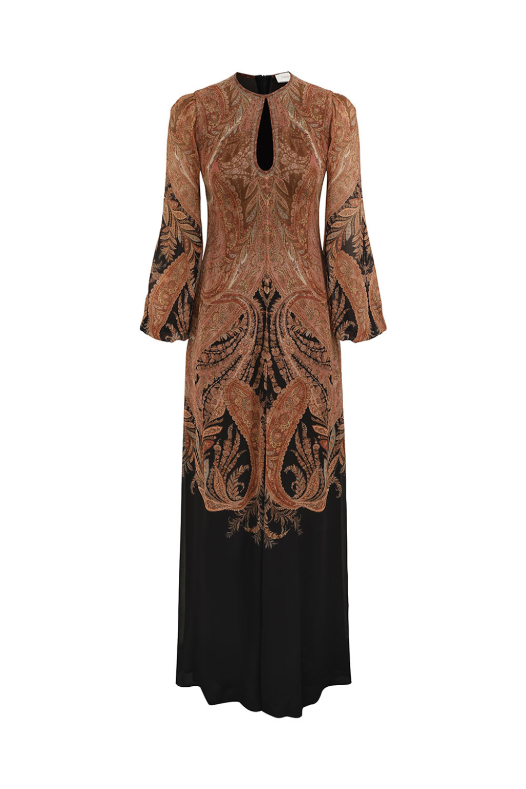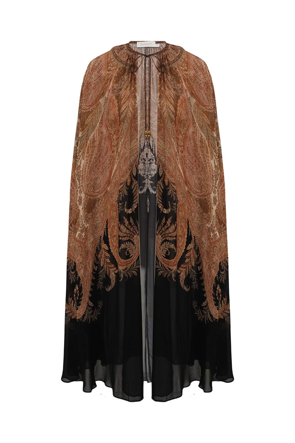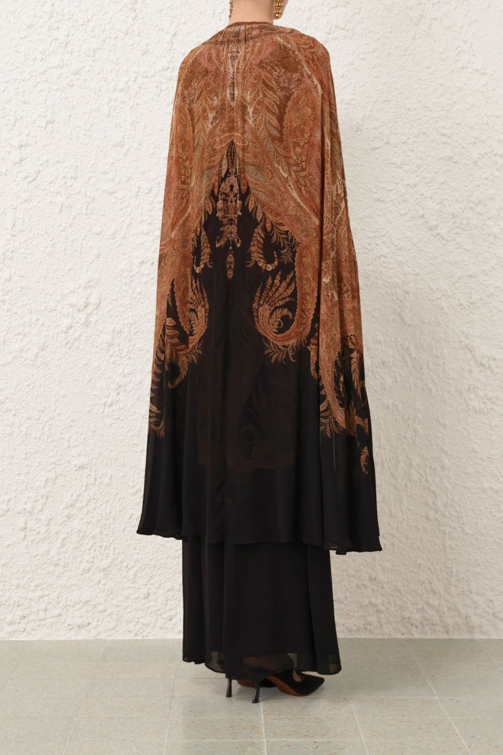 The Hypnotic Caped Maxi Dress in Black Paisley from the Fall 2025 Collection, Hypnotic. A long sleeve maxi dress featuring a keyhole neckline, buttoned cuffs and a detachable cape tied at the neckline. Center back invisible zip closure.
