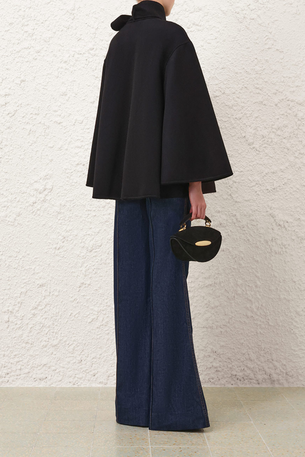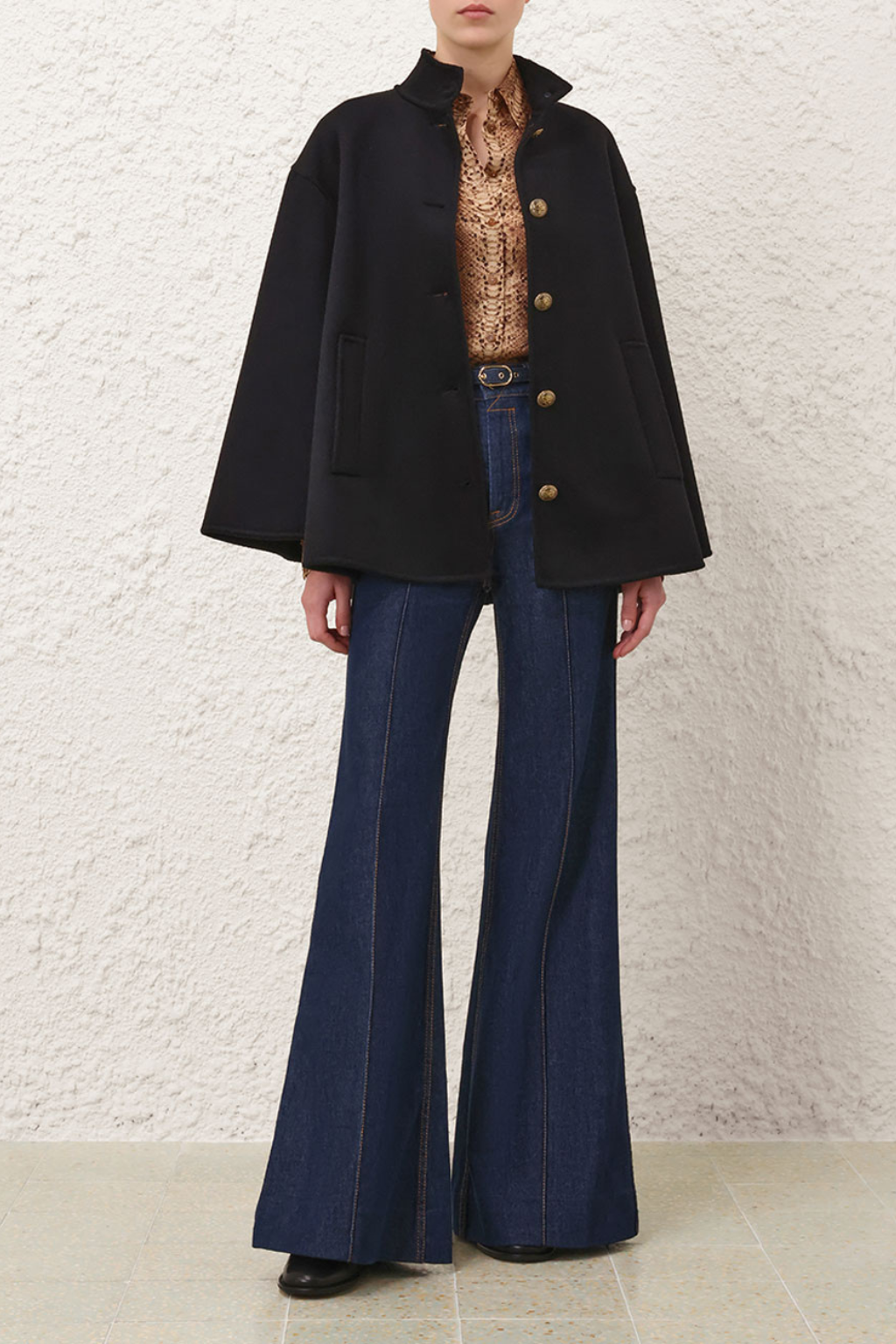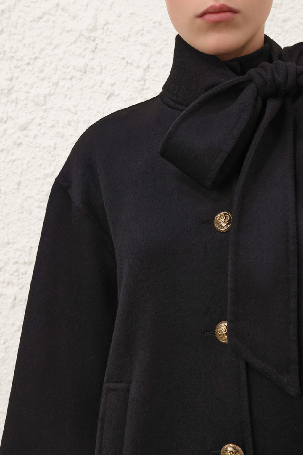 The Hypnotic Pussybow Coat in Black from the Fall 2025 Collection, Hypnotic. A double faced wool blend coat featuring a stand collar with removable pussybow necktie, wide sleeves and gold military style buttons down the center front. With a swingy silhouette and functional side pockets this coat will surely put a spring in your step.