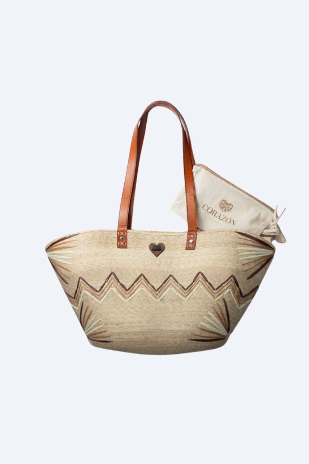 Corazon Playero's Large tote palm bag is ideal for days out or vacation at the beach. Crafted by artisans in Mexico with leather accents. Detachable lining inside and a cosmetic pouch.