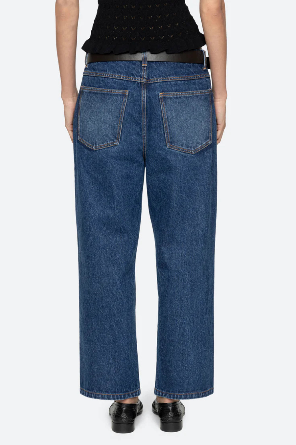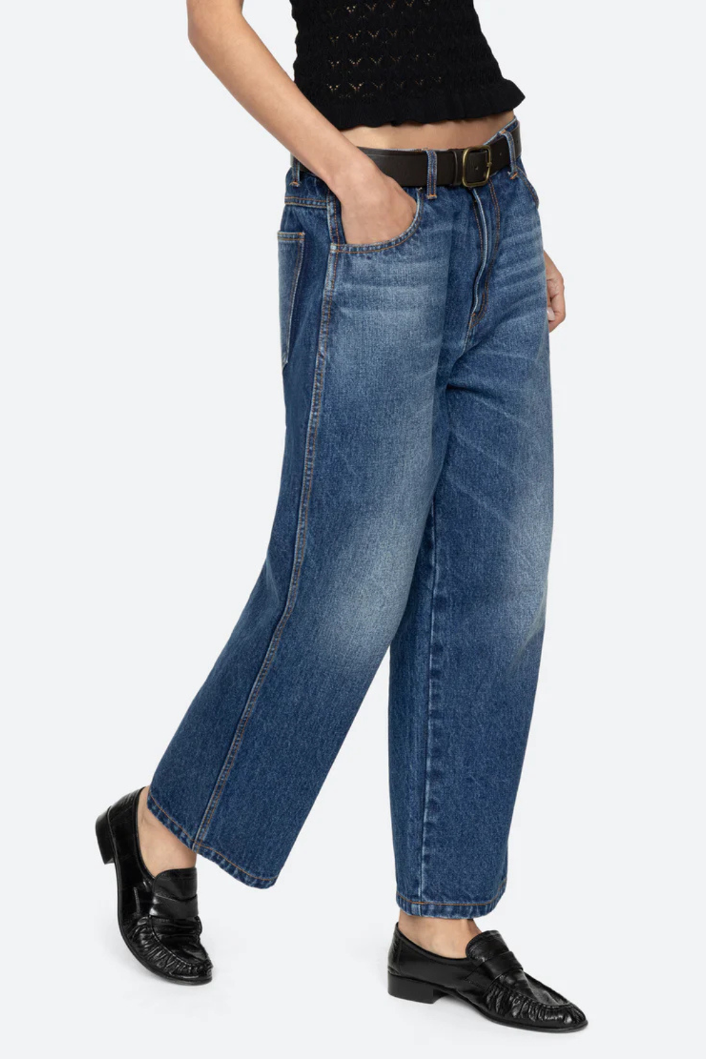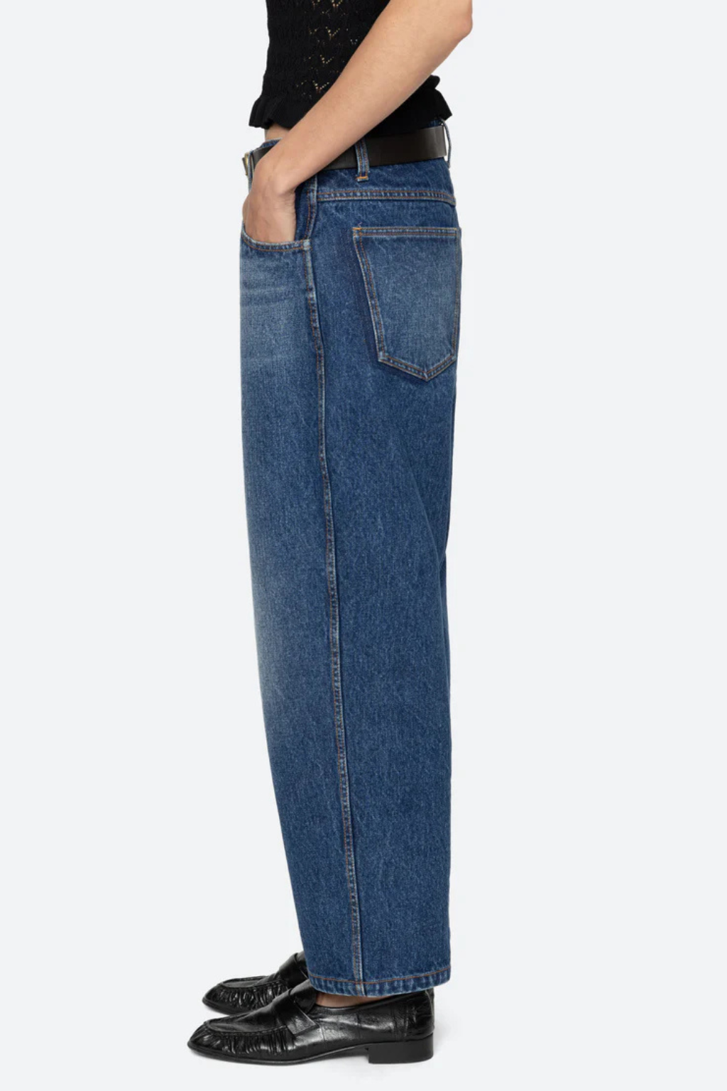 The Jules denim jean features a relaxed, mid-rise silhouette with a removable belt. With a straight-leg fit, subtle distressing, and a softly faded wash, it's a versatile, vintage-inspired staple made for effortless styling.
