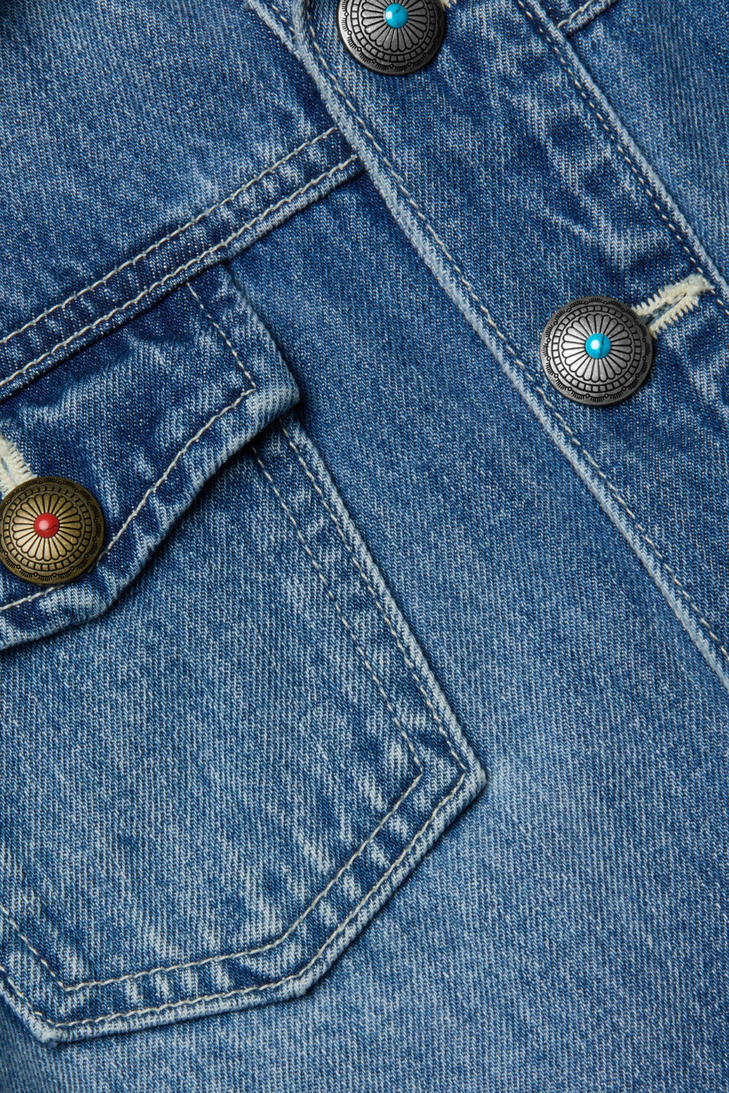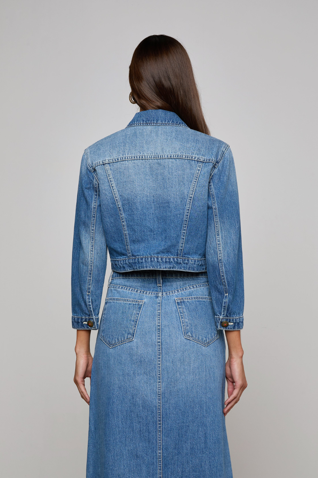 The iconic jean jacket reimagined in a clean cropped cut. Now in a medium wash with highs and lows, finished with novel buttons new to Summer '25. Crafted in all-cotton denim with 3/4 sleeves, flap pockets and rivet button closure.