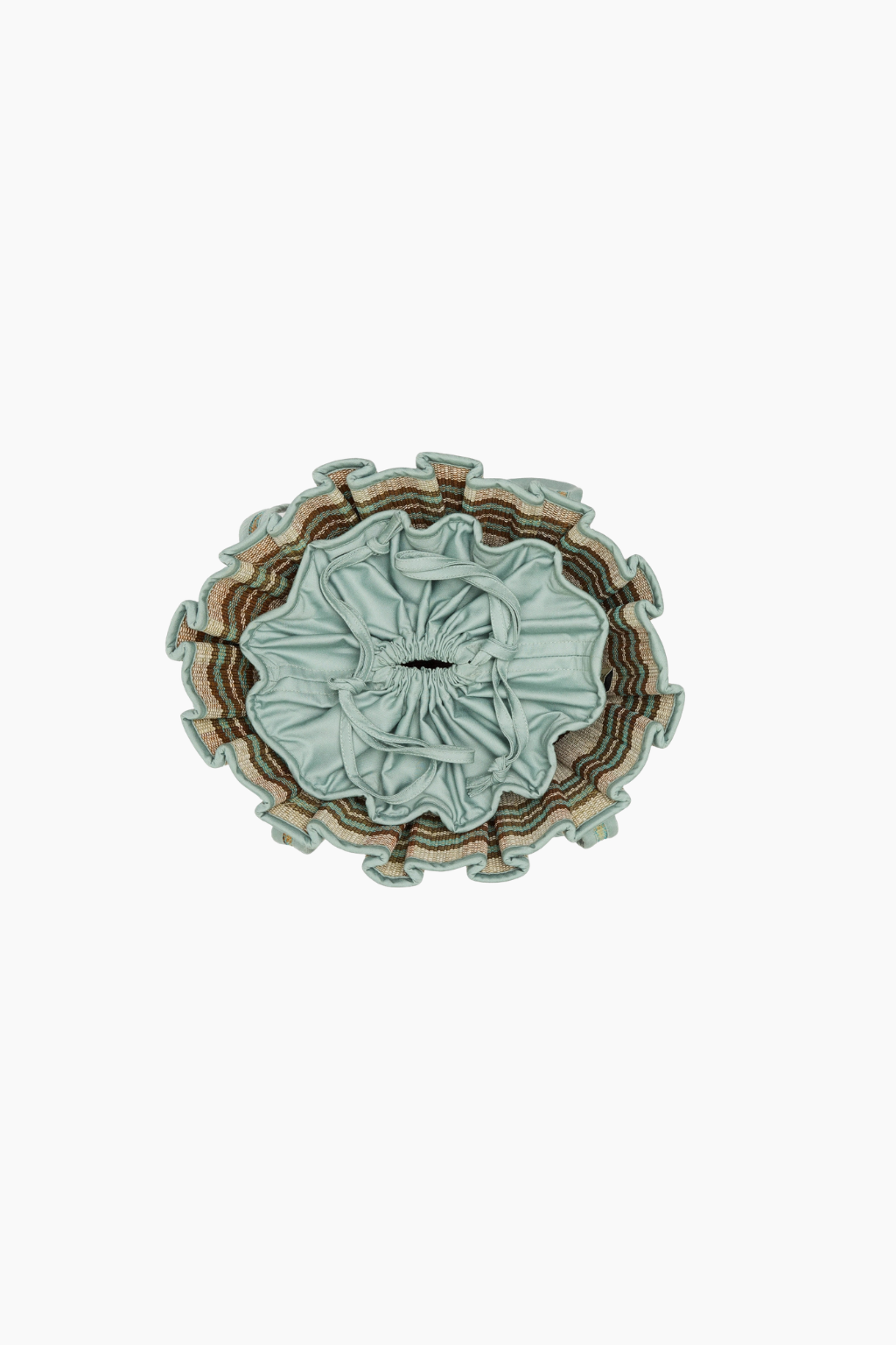 The Lake Como Mini St Tropez Tote features milk-white, bisque-brown and lagoon-green thread colous woven horizontally through the striped sections of natural and tan hand-dyed grass fibers, with pale-green fabric trimming.