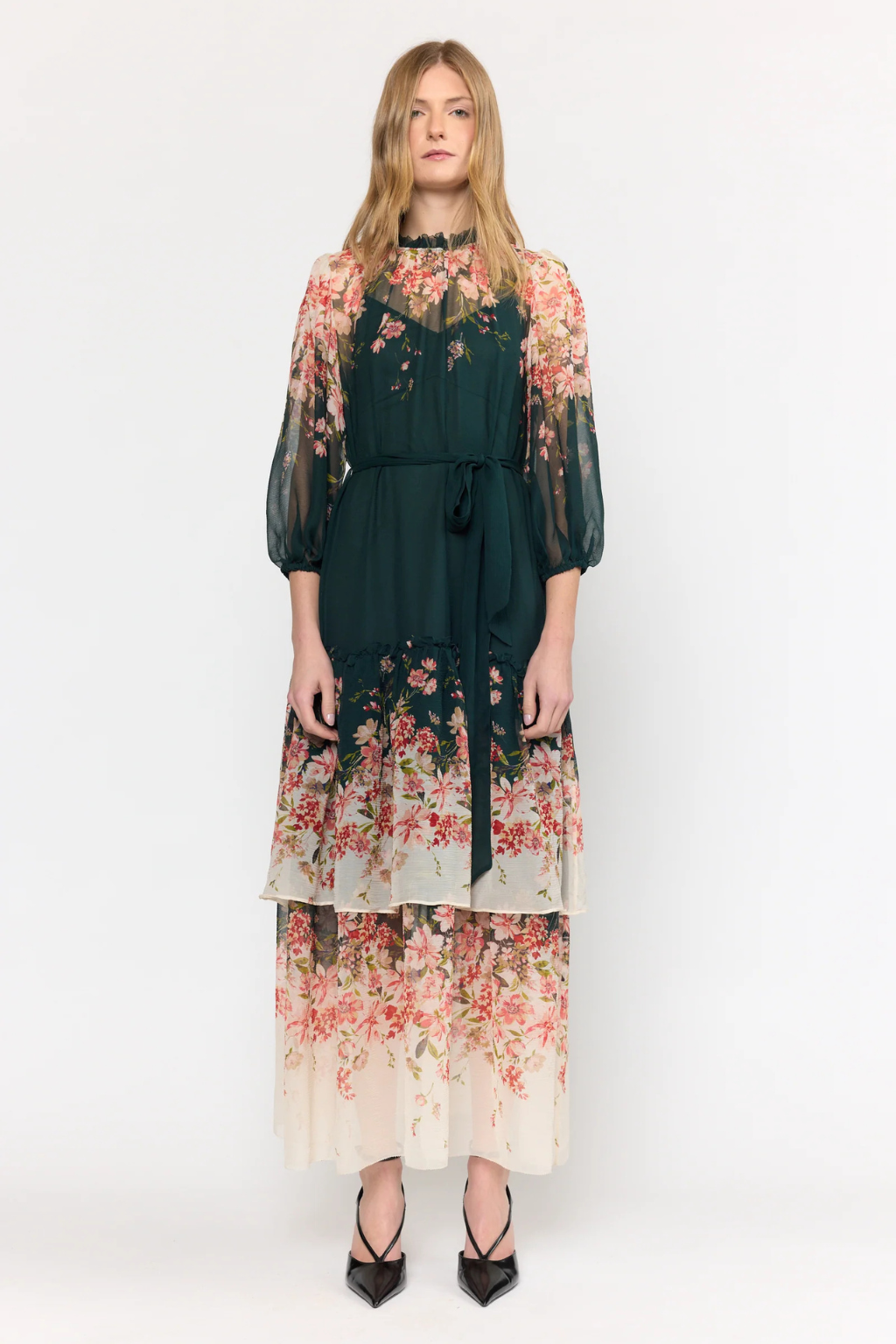 The Linda Dress in goldenrod offers an elegant floor-length silhouette with tiered layers that create graceful movement. Its loose sleeves extend below the elbow, complementing the high neckline adorned with delicate upward-facing ruffles. A belt cinches the waist for a flattering shape, while dark sheer fabric with a subtle floral pattern accents the bottom tiers and shoulders, adding refined texture and visual interest. This dress combines classic design elements with modern detailing, perfect for many occasions.