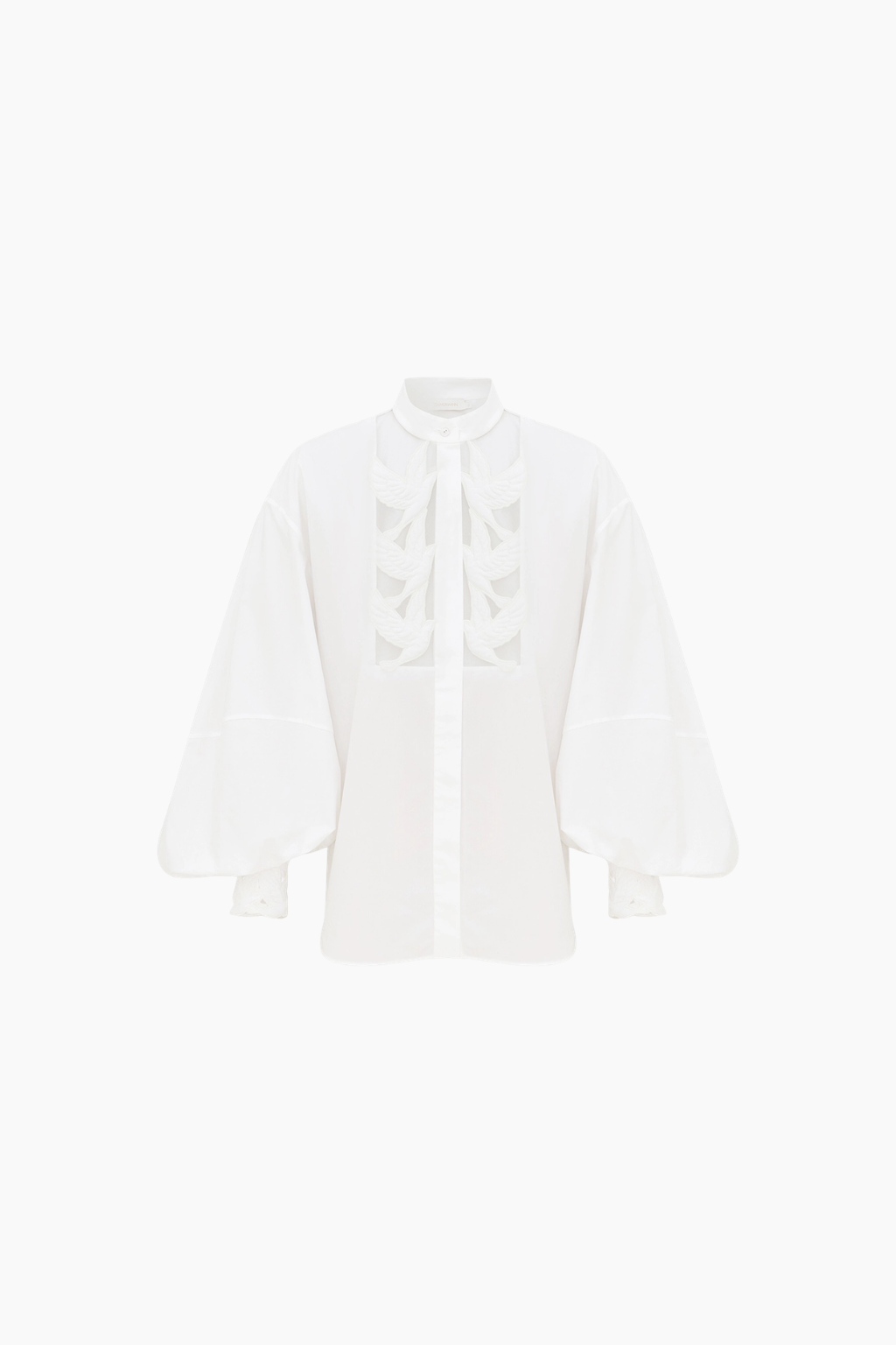The Luna Applique Blouse in Ivory from the Spring 2026 Collection, Kindred Spirit. A cotton blouse featuring a stand collar, long blouson sleeves, fitted button cuffs, finished with concealed center front buttons, partial side splits and an asymmetric hem.