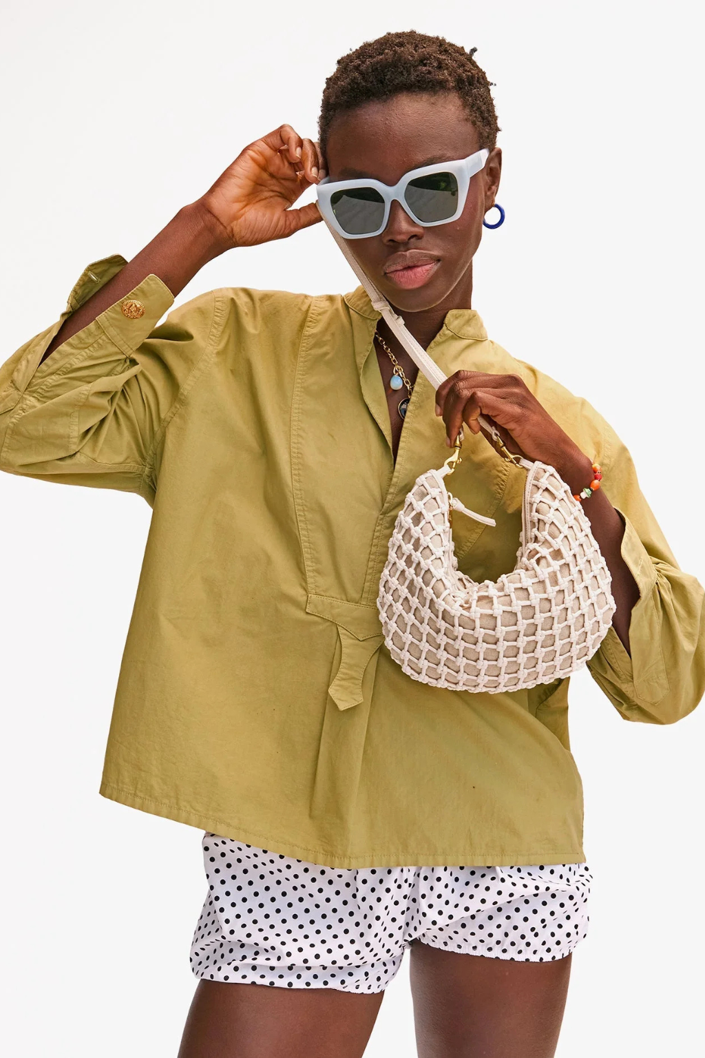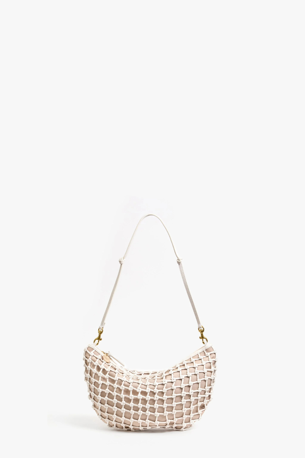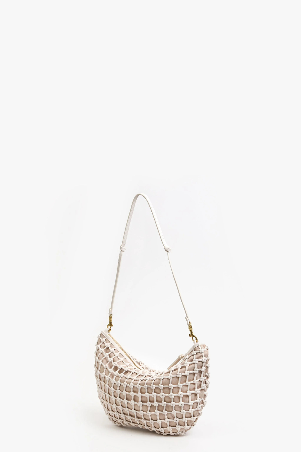 The Lune holds your phone, keys, small wallet and sunnies and a tiny bit of 'tude. Made of knot woven leather and a cream zipper closure, knotted shoulder strap. Lined in natural cotton twill. No interior/exterior pockets.