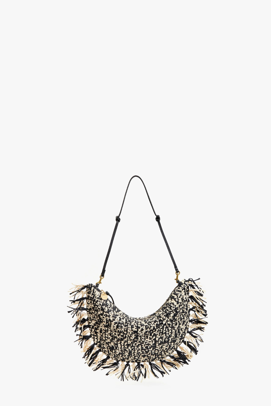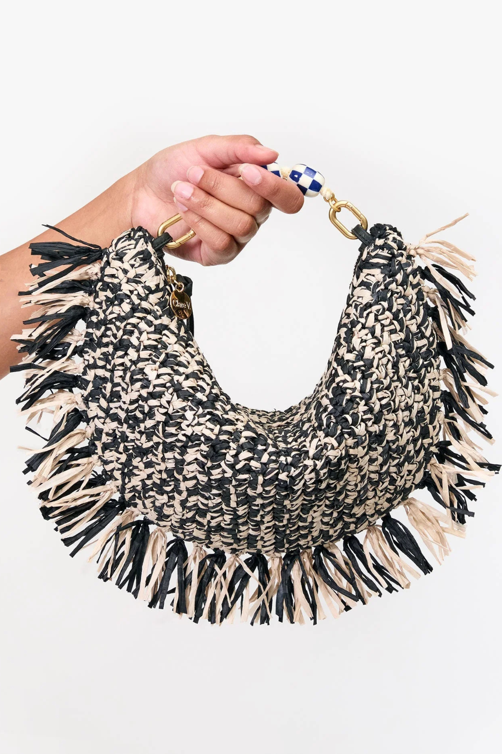The Lune holds your phone, keys, small wallet and sunnies - and a tiny bit of 'tude. Made of raffia with fringe (Psst... if the fringe gets a little bent, a quick steam will straighten it out–no harm to the bag.). Zipper closure, knotted shoulder strap. Lined in chambray. Black zipper. No interior/exterior pockets.