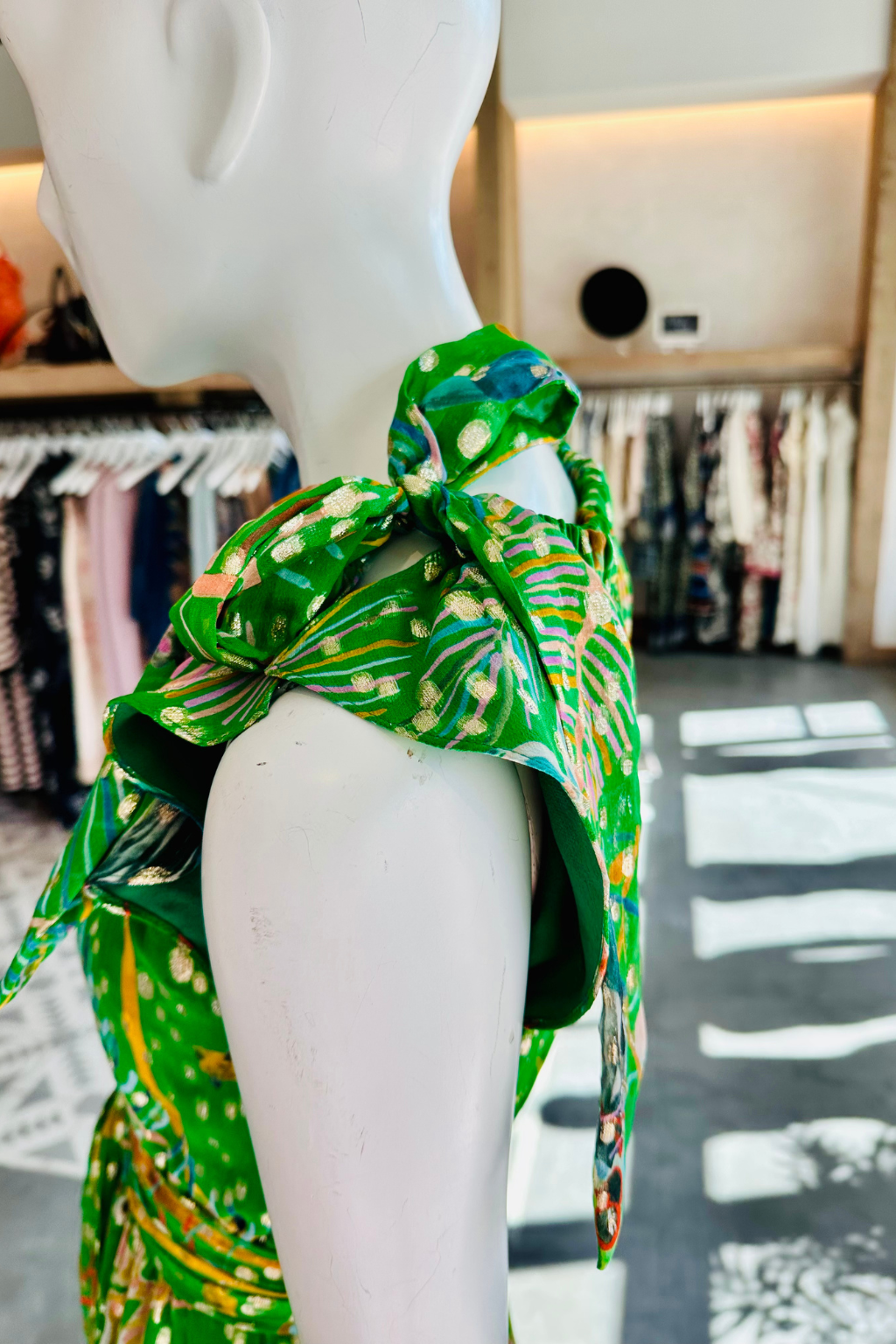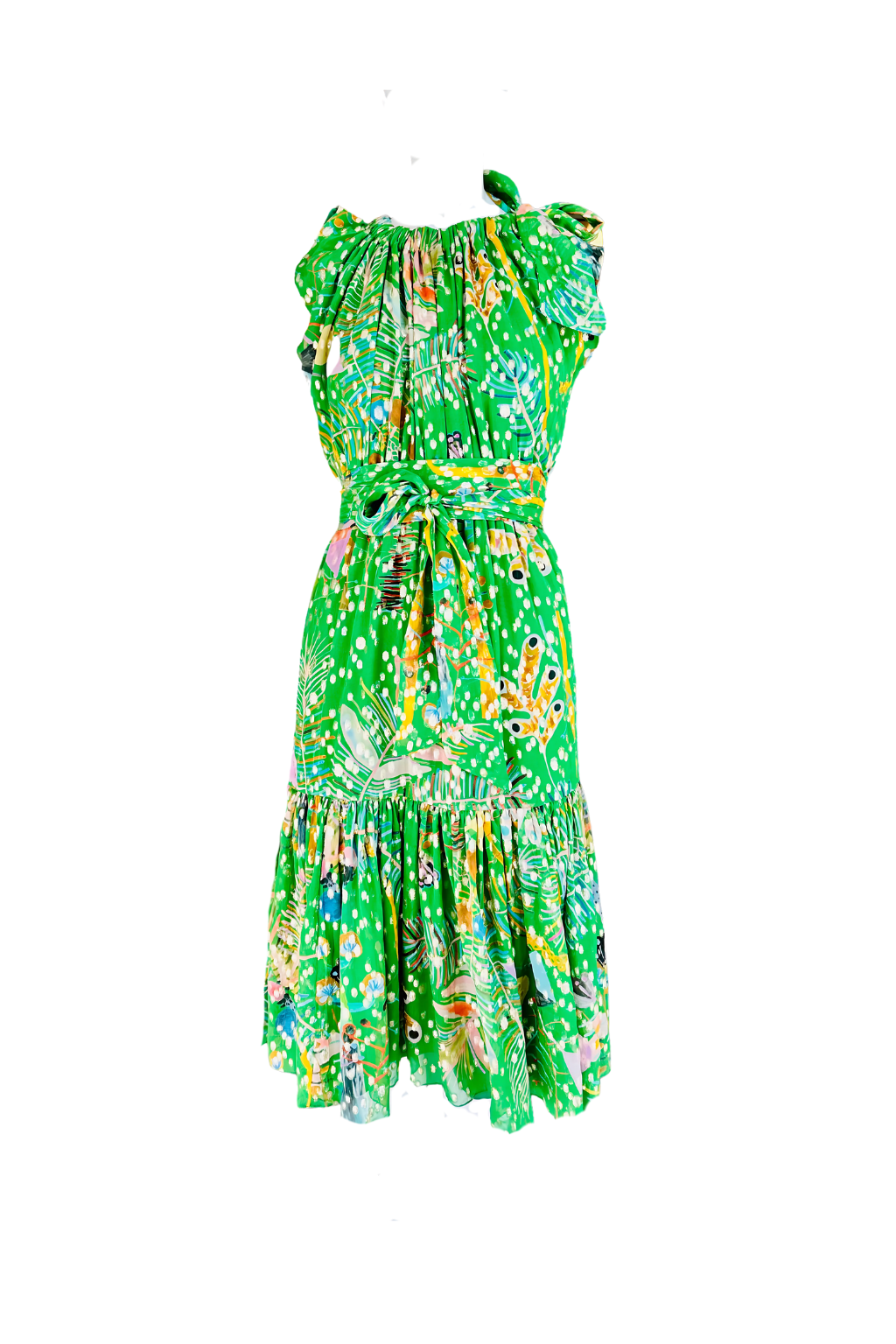 Elasticated round neck with side tie and pretty open sleeve. Gathered tiered midi skirt with elasticated waist. Fully lined with French seams. Matching sash belt. Exclusive to Permanent Vacation.
