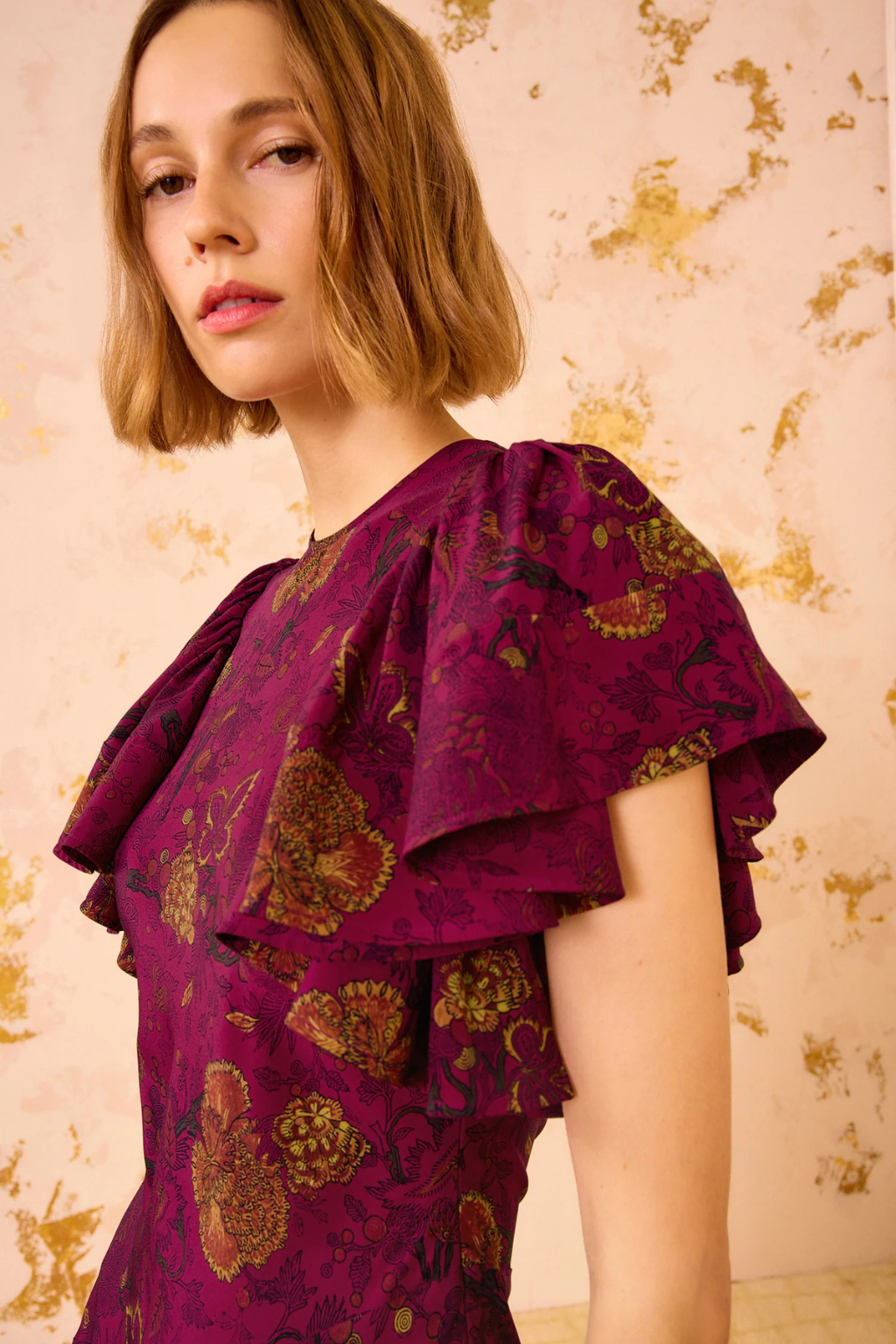 The Mariam Dress is a study in easy elegance, cut on the bias into a midi silhouette that skims the form. It is crafted from silk crepe de chine alive with botanicals inspired by a 19th century French print and is finished with fluttering sleeves. Designed to be fitted at the bust and waist, gently flares at hem. With side pockets.