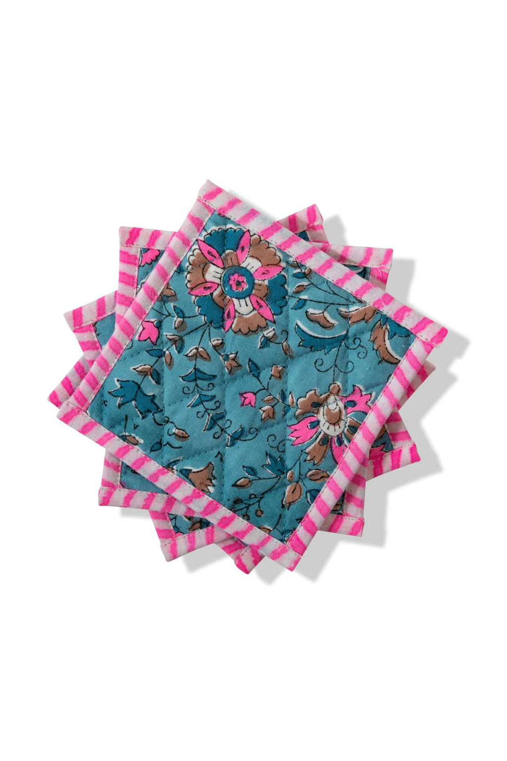 Cocktail hour gets extra festive with these block print quilted coasters coupled with the matching tea towels elevate the everyday and add a colorful charm to your kitchen or powder room.We love the charming color combo, and the chic striped trim. Makes an excellent gift!