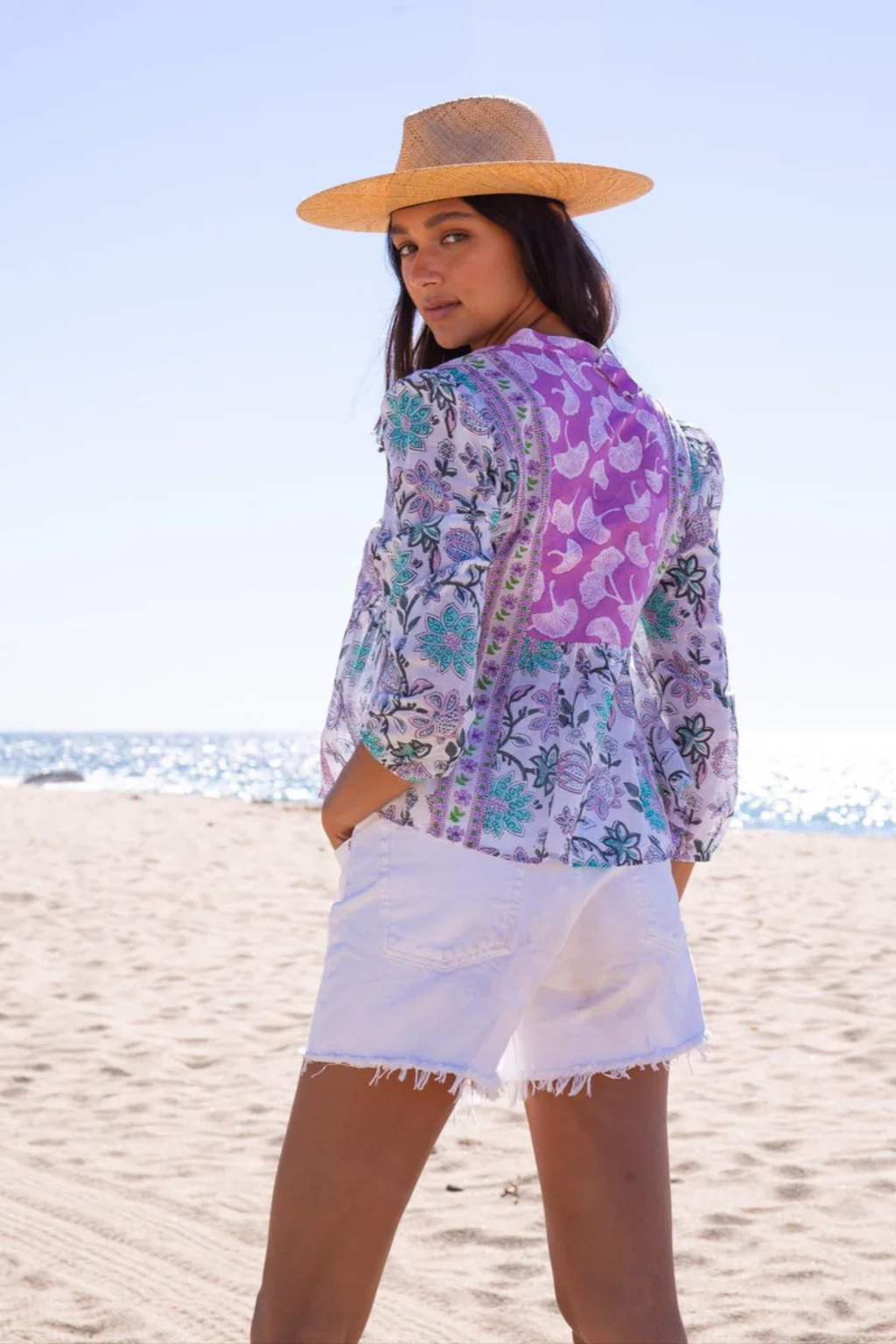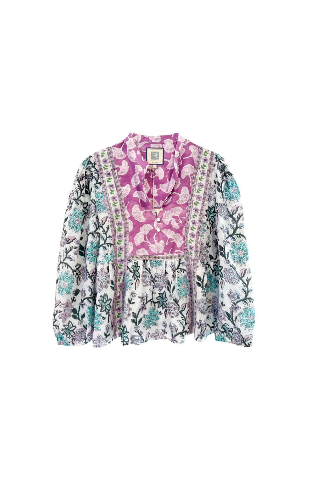 Silk cotton voile hand blocked top with long balloon sleeves, contrast yoke and button up detailing.