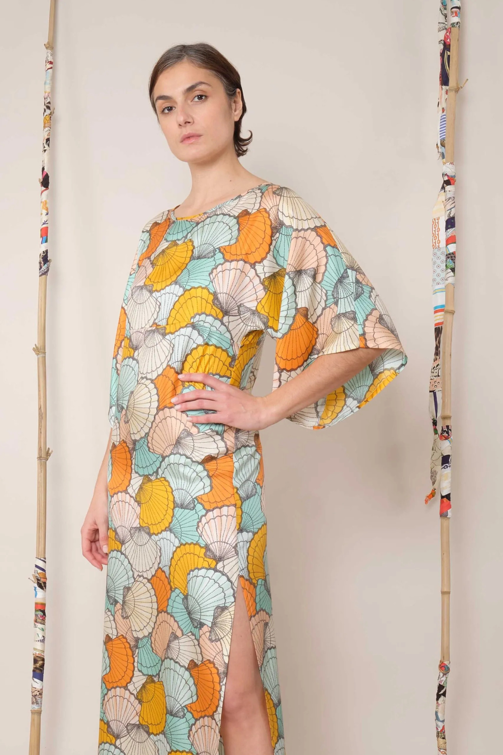 Maxi dress with three quarter length flared sleeves and a slit on left side. The Midday Dress is crafted in the original print "ST JACQUES” based on Laurence Kiberlain's drawings.