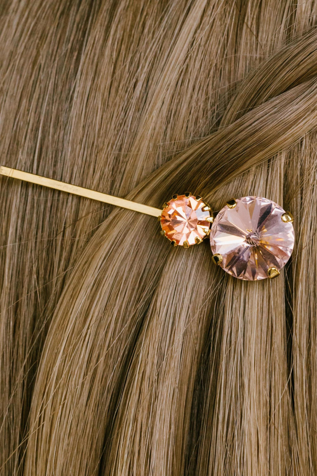 The Myrla Bobby Pin is made in New York of crystals on a durable light antique gold plated bobby pin, designed to stay firmly in place, once other pins have the hairstyle securely fastened. We recommend treating each pin as you would a piece of jewelry, and storing in the dust bag when not in use. Avoid contact with water, perfume, and other chemicals, including hairspray, which should be used before placement in the hair.