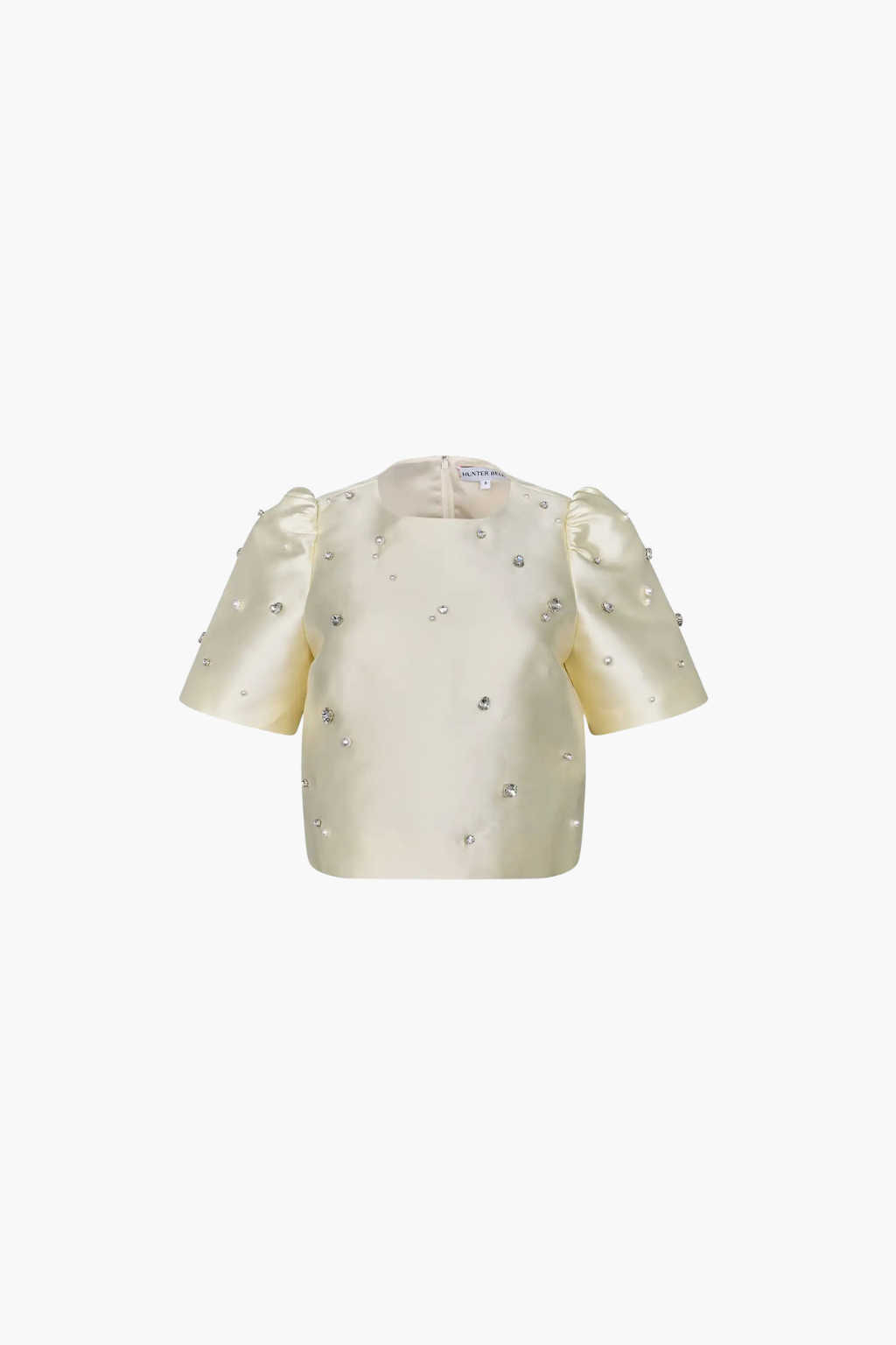The Olivia Top embodies understated glamour. Cut from luminous Ivory duchess satin, this short-sleeve crewneck top is finished with hand-embroidered pearl-and-rhinestone detailing for a refined hint of sparkle. The Olivia Top pairs perfectly with your favorite high-waisted jeans or skirts, making every outfit effortlessly chic and fun.