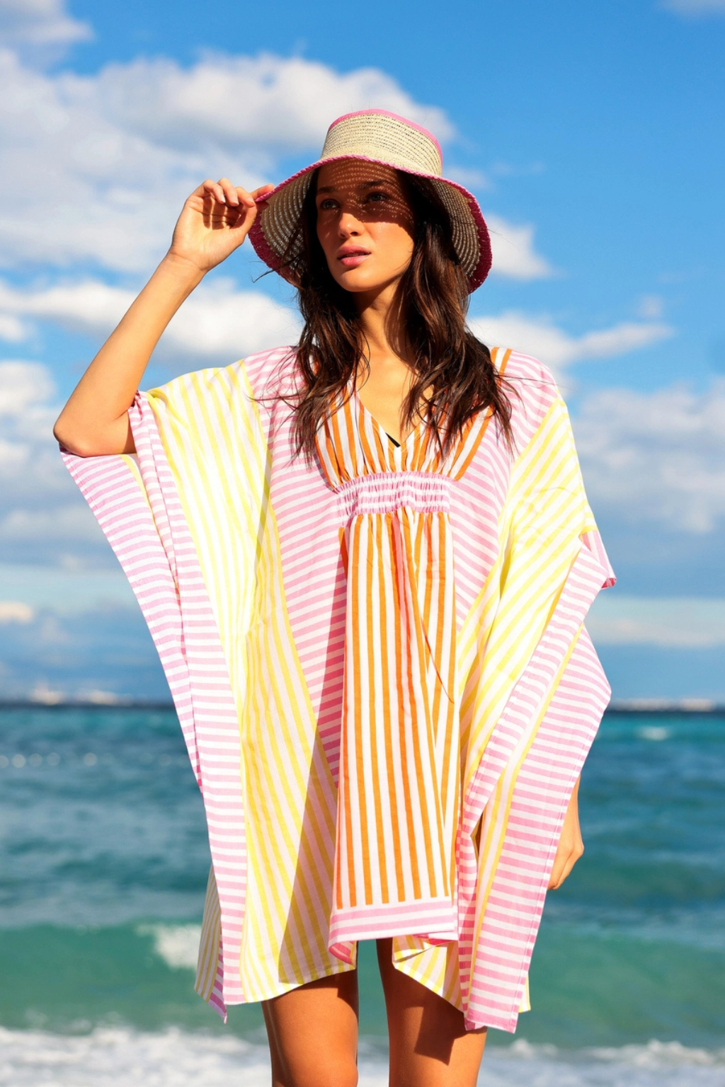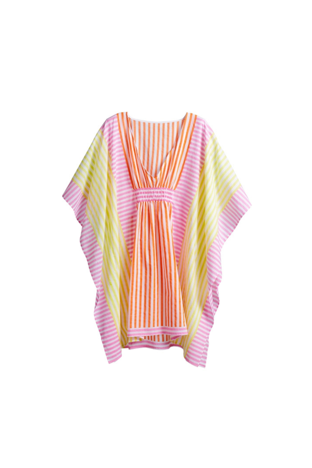 The Palm Springs Cover-Up is a vibrant mix of colorful stripes that makes poolside lounging even more fun! Featuring a flattering V-neckline and a gathered empire waist, it flows effortlessly to keep you comfy and chic. Its lightweight, breathable fabric is perfect for sunny days, whether you're heading to the beach or sipping cocktails by the pool. Designed with relaxed elegance, it's your go-to cover-up for all summer adventures.