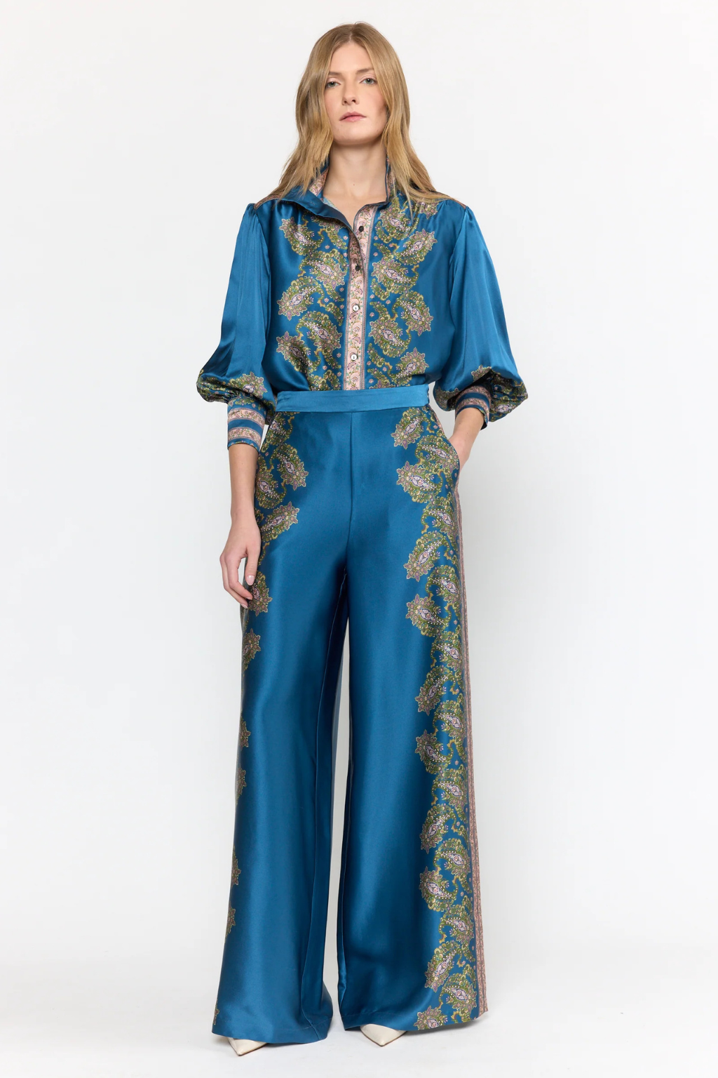 The Paloma Top in Prussian Paisley features a thoughtfully placed print with slight bishop sleeves that gather elegantly at the cuffs. Its simple yet sophisticated collar complements the button-up placket running down the center, offering a polished and timeless look suitable for formal settings.